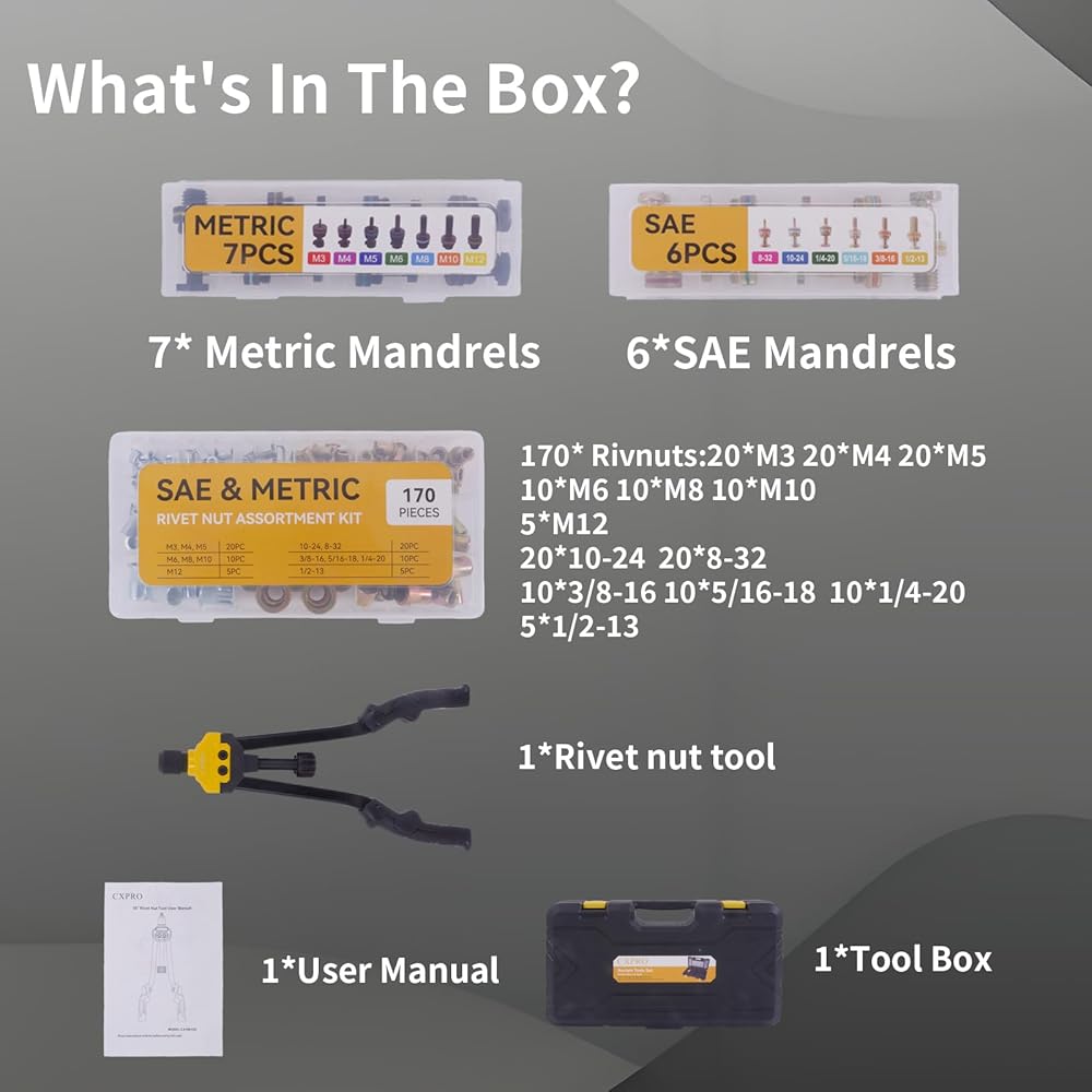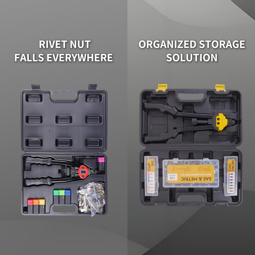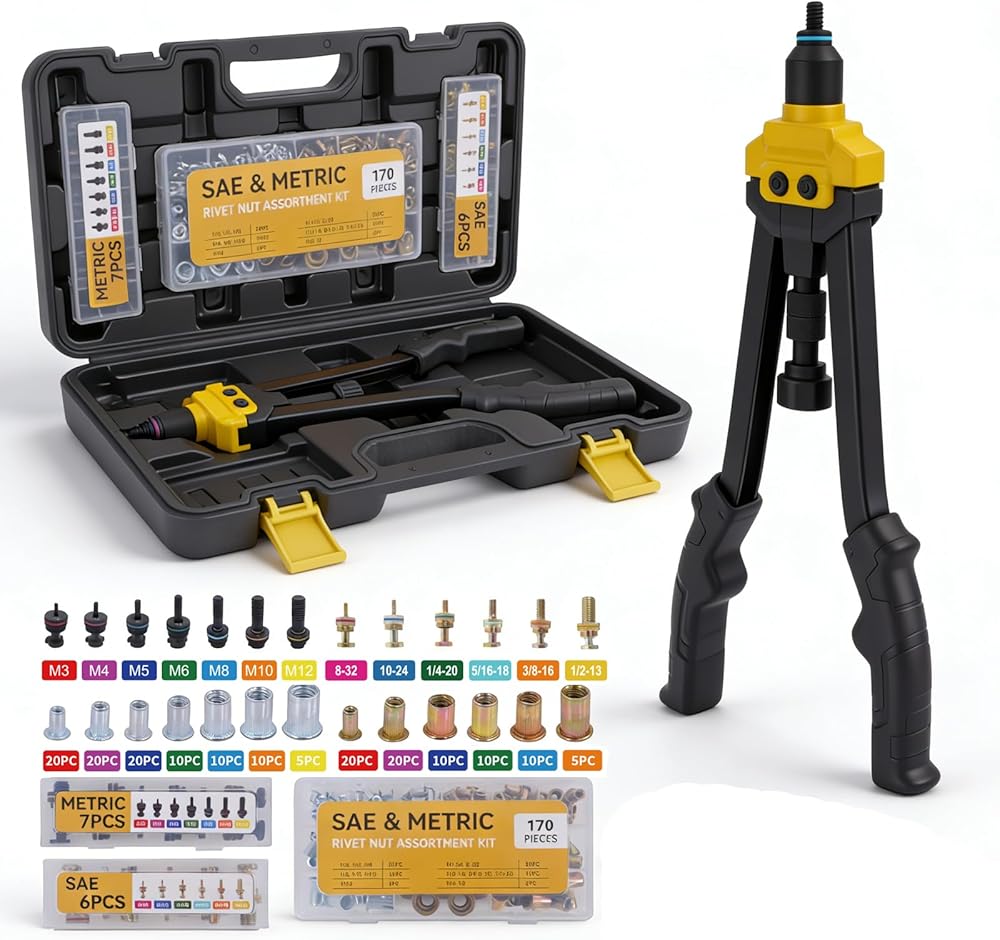 مجموعة أدوات صامولة البرشام، مجموعة أدوات ريفنوت 16 بوصة مع 13 مماسك متري وSAE، مجموعة متنوعة من صواميل البرشام 170 قطعة، حقيبة حمل متينة، مثالية للصفائح المعدنية وأعمال السيارات