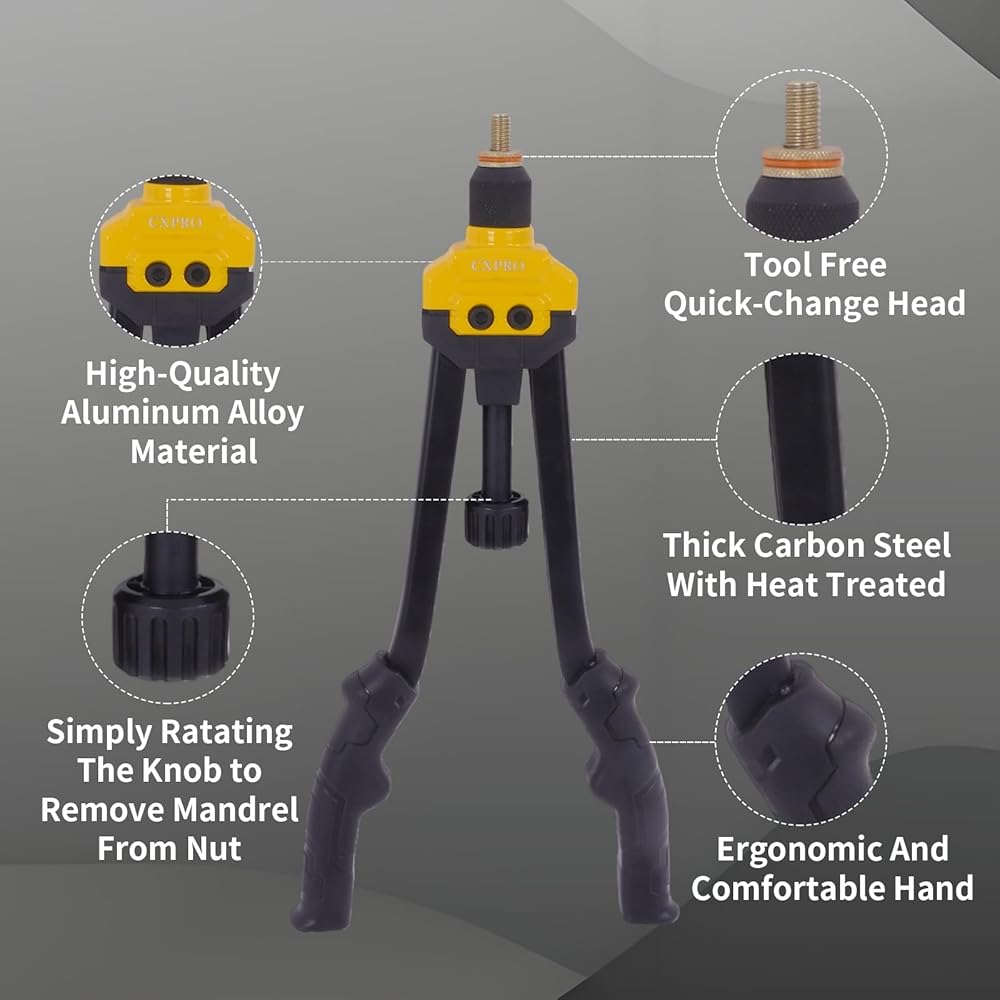 • هيكل متين: أداة برشام شديدة التحمل مصممة لأعمال الصفائح المعدنية والسيارات، مما يضمن أداء موثوقًا للتطبيقات الاحترافية والتطبيقات المنزلية. يمكن استخدام أداة صامولة برشام اليد الملولبة لربط الصفائح المعدنية المختلفة بشكل آمن في مناسبات مختلفة مثل المنزل والديكور، والأعمال المعدنية، والبناء، والسباكة، والدراجات، والطرق الوعرة، وتعديل المركبات الترفيهية وقوارب الكاياك.