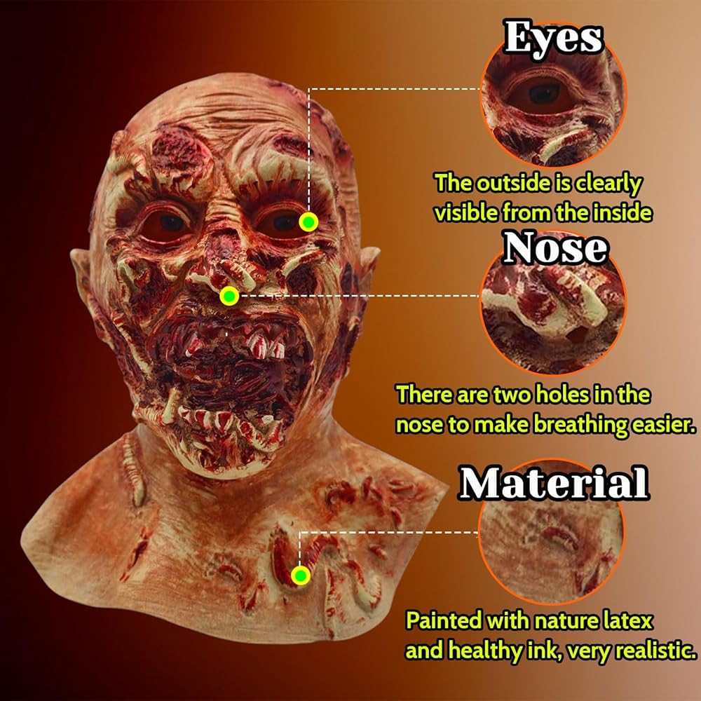 تخلق الأنسجة المتعفنة المعقدة والتصميمات الشبيهة بالديدان المتلألئة والجروح الدموية مظهرًا زومبيًا واقعيًا بشكل صادم. كل أخدود وندبة تجعل الناس يشعرون وكأنهم يواجهون وحشًا حقيقيًا، وهو مثالي لمنح الضيوف قلبًا - إيقاف الخوف في المنازل المسكونة أو حفلات الهالوين.