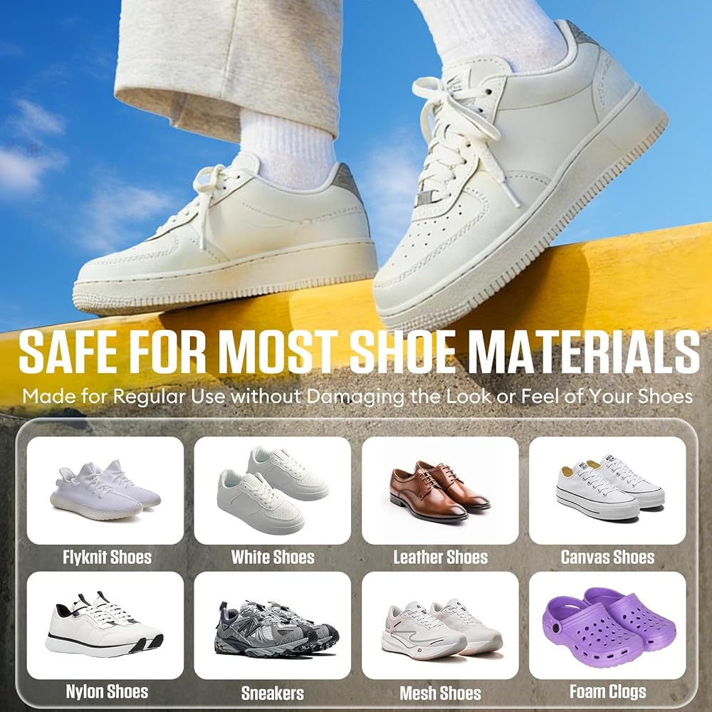 لطيف على الأحذية واليدين - آمن وفعال على الجلد والقماش والشبك والمطاط والفينيل والقماش. ينظف دون أن يبهت اللون أو يتلف الملمس - رائع للأحذية الرياضية البيضاء والأحذية الكاجوال وأحذية الفساتين والأحذية طويلة الرقبة والكعب.