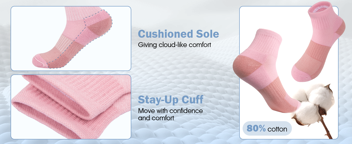 The womens ankle socks feature a full-coverage thickened cushioned sole, it provide shock absorption plantar impact from the ground and reduces vibration to protect your feet; The socks ergonomic 3D arch support is contoured to the natural curve of the foot, evenly distributing plantar pressure
