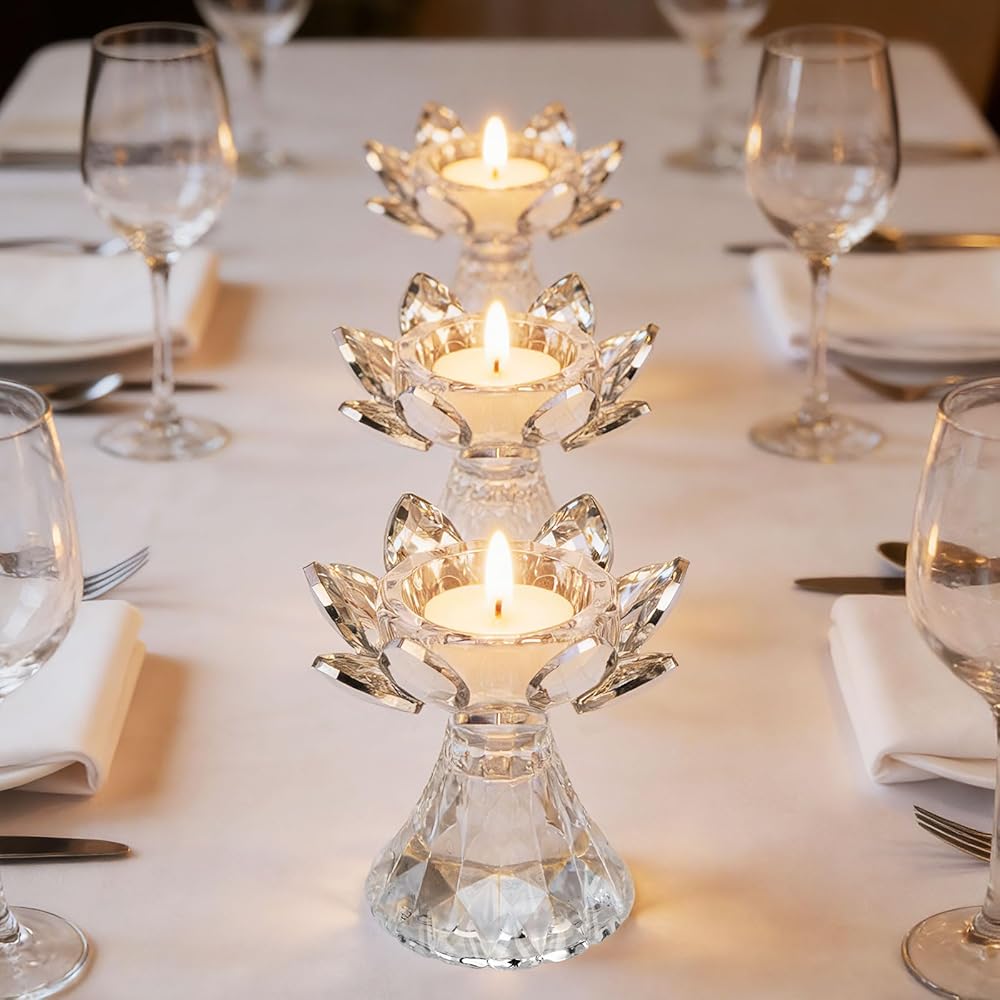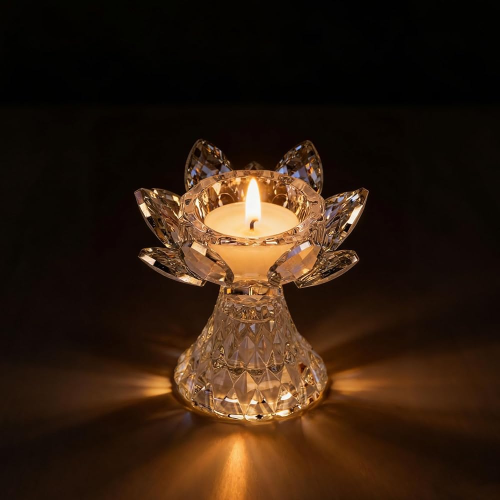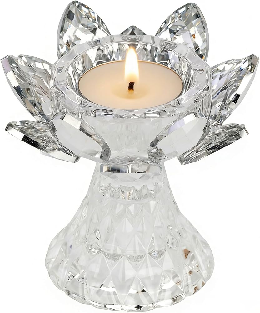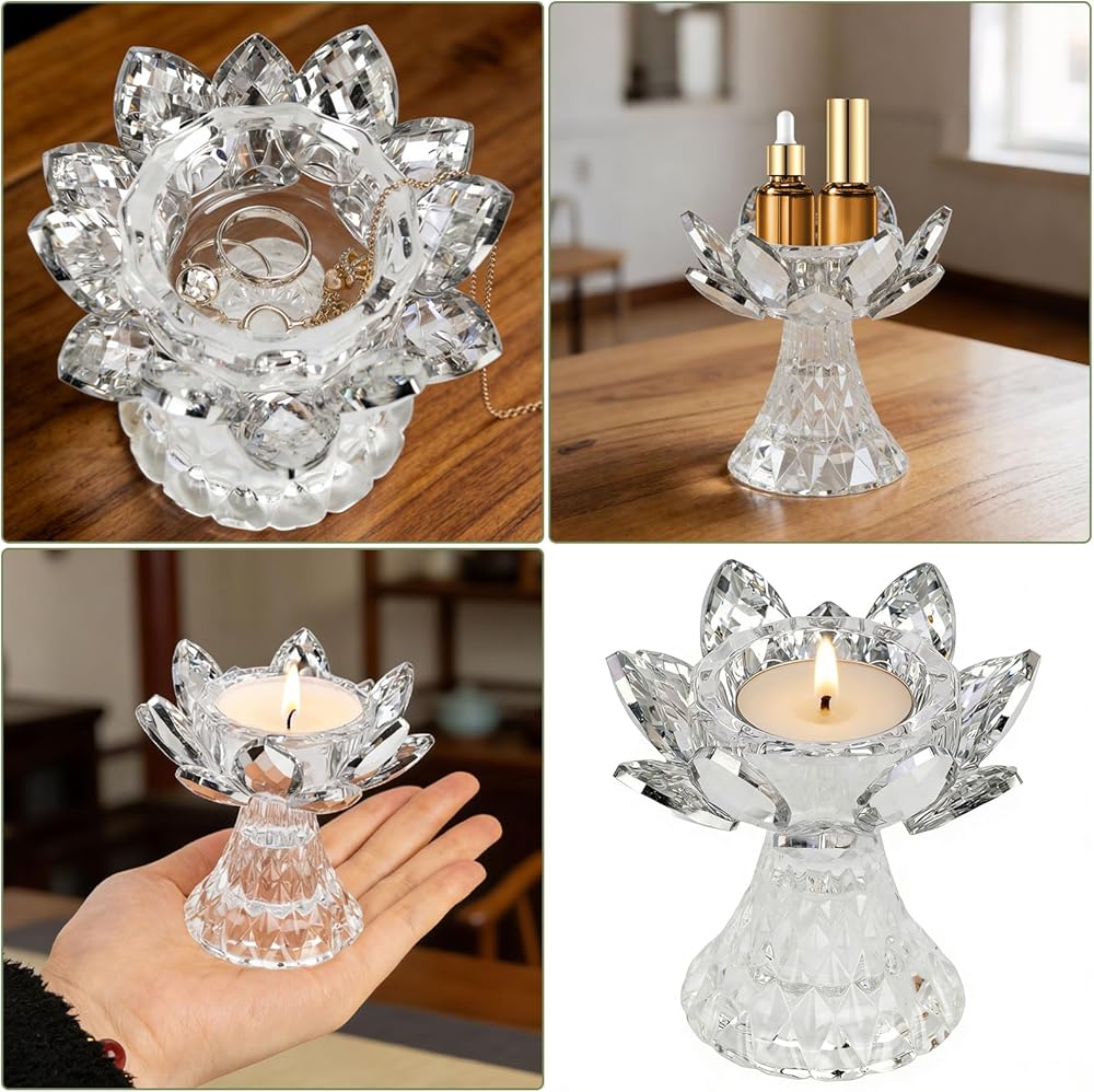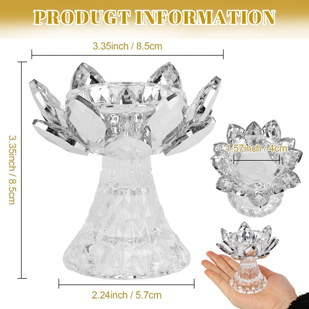 حامل الشموع مصنوع من مادة الكريستال والكريستال الشفاف المتلألئ والقص الرائع. يتميز بشكل زهرة اللوتس وأوجه متلألئة تبدو جميلة ومثالية لمفضلات الحفلات والديكورات لإضافة جو رومانسي ومريح.