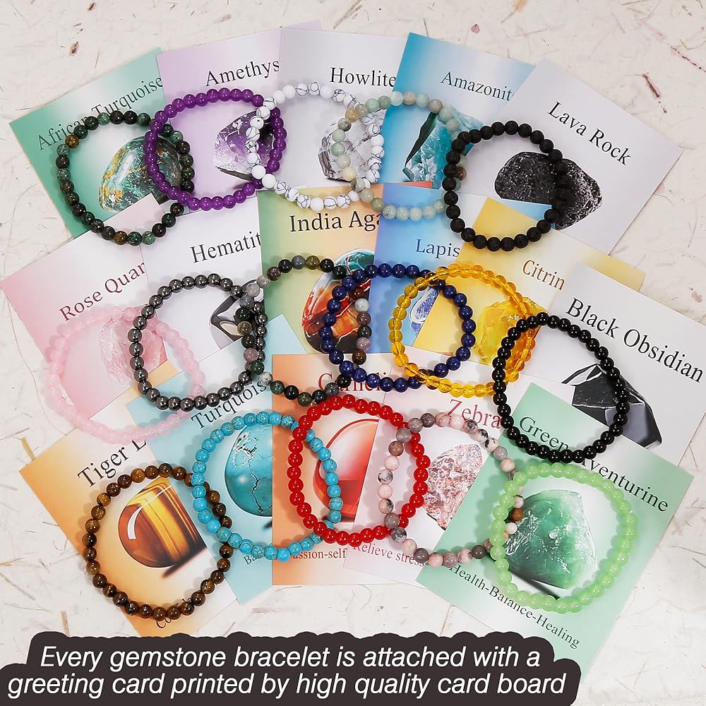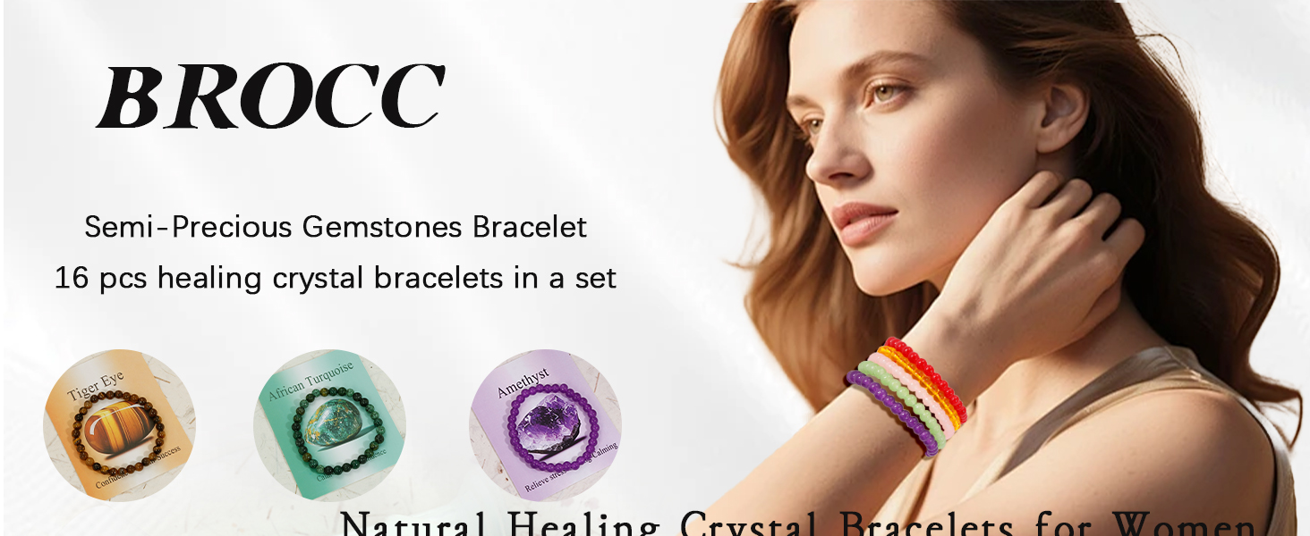BROCC 16 قطعة من أساور الكريستال العلاجية الطبيعية للنساء والرجال، 6 مم خرز دائري أحجار كريمة قابلة للتمدد، مجموعة هدايا أساور من حجر الكريستال العلاجي