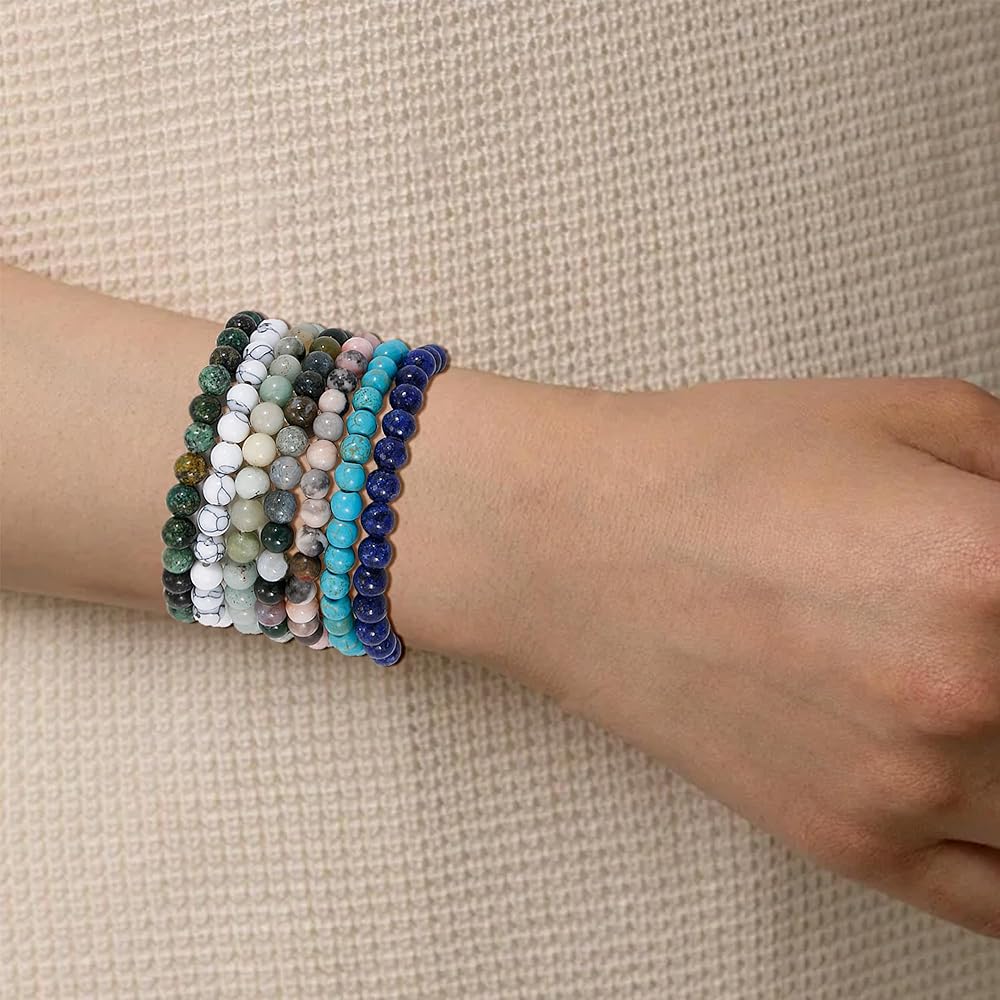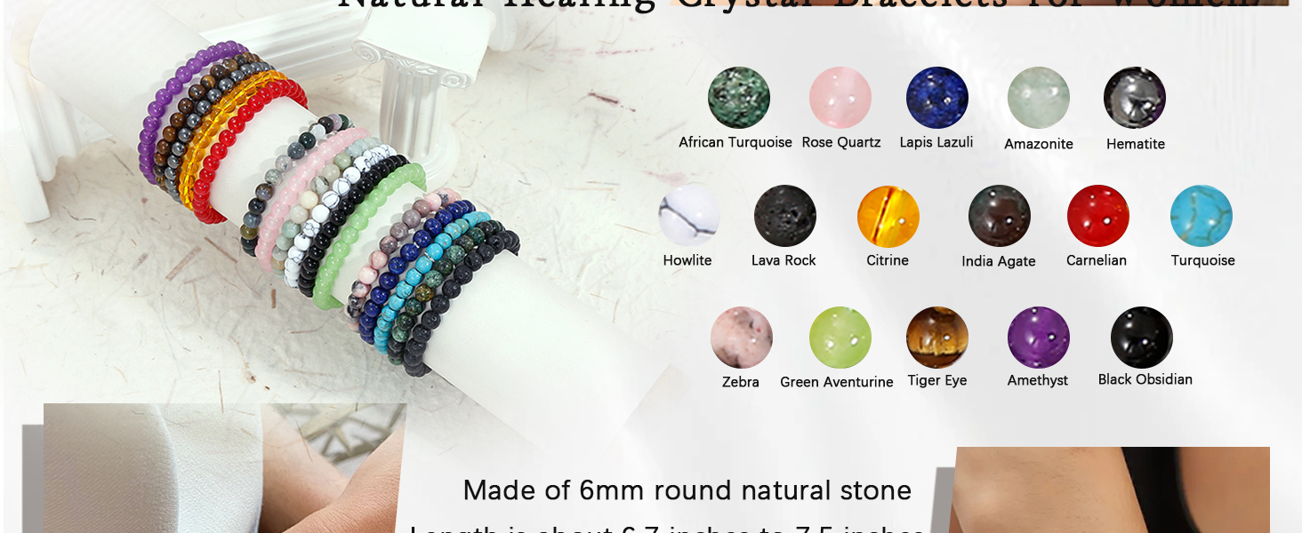 سوار من الخرز المطاطي: هذه الأساور المصنوعة من الخرز الكريستالي مصنوعة من حجر طبيعي مستدير مقاس 6 مم. طول السوار حوالي 6.7 بوصة إلى 7.5 بوصة (17-19 سم). مصنوع يدويًا، مريح وسهل الارتداء، يناسب معظم المعصم