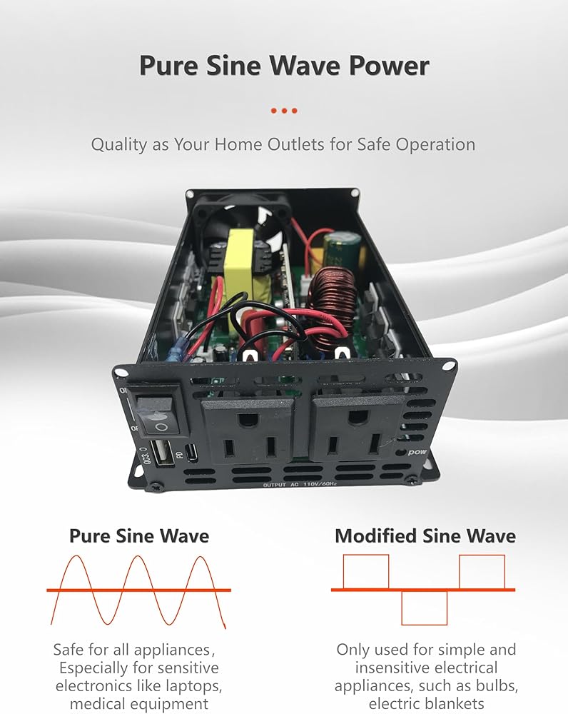 خرج موجة جيبية نقية حقيقية: يولد طاقة تيار متردد نظيفة ومستقرة، مماثلة لمنفذ الحائط المنزلي الخاص بك. يعمل بأمان على تشغيل الأجهزة الإلكترونية الحساسة مثل أجهزة الكمبيوتر المحمولة والأجهزة الطبية (مثل أجهزة CPAP) والأدوات دون التعرض لخطر التلف.