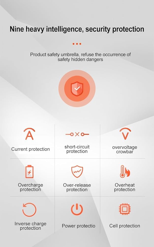 حماية شاملة: ضمانات مدمجة بما في ذلك الحمل الزائد، والجهد الزائد، والجهد المنخفض، والدائرة القصيرة، ودرجة الحرارة الزائدة، وحماية القطبية العكسية تضمن السلامة القصوى لأجهزتك والعاكس نفسه.