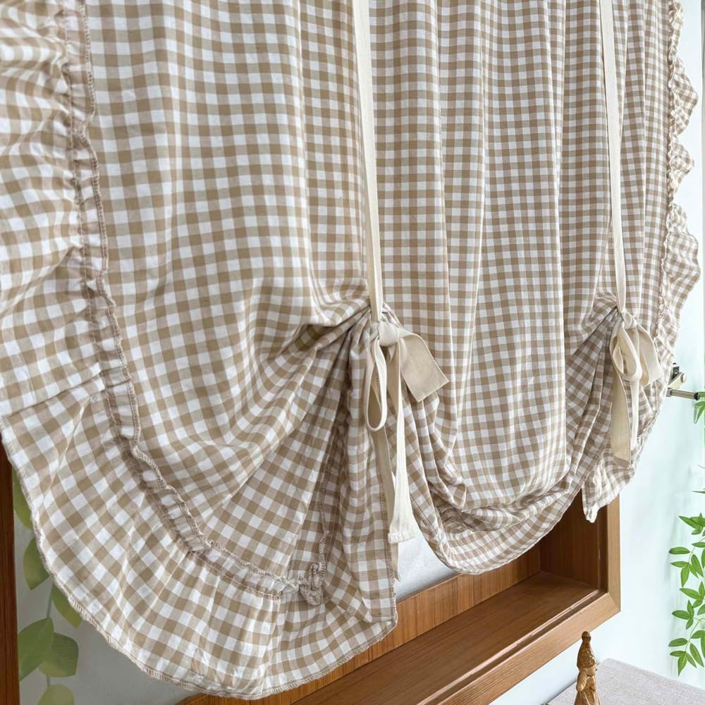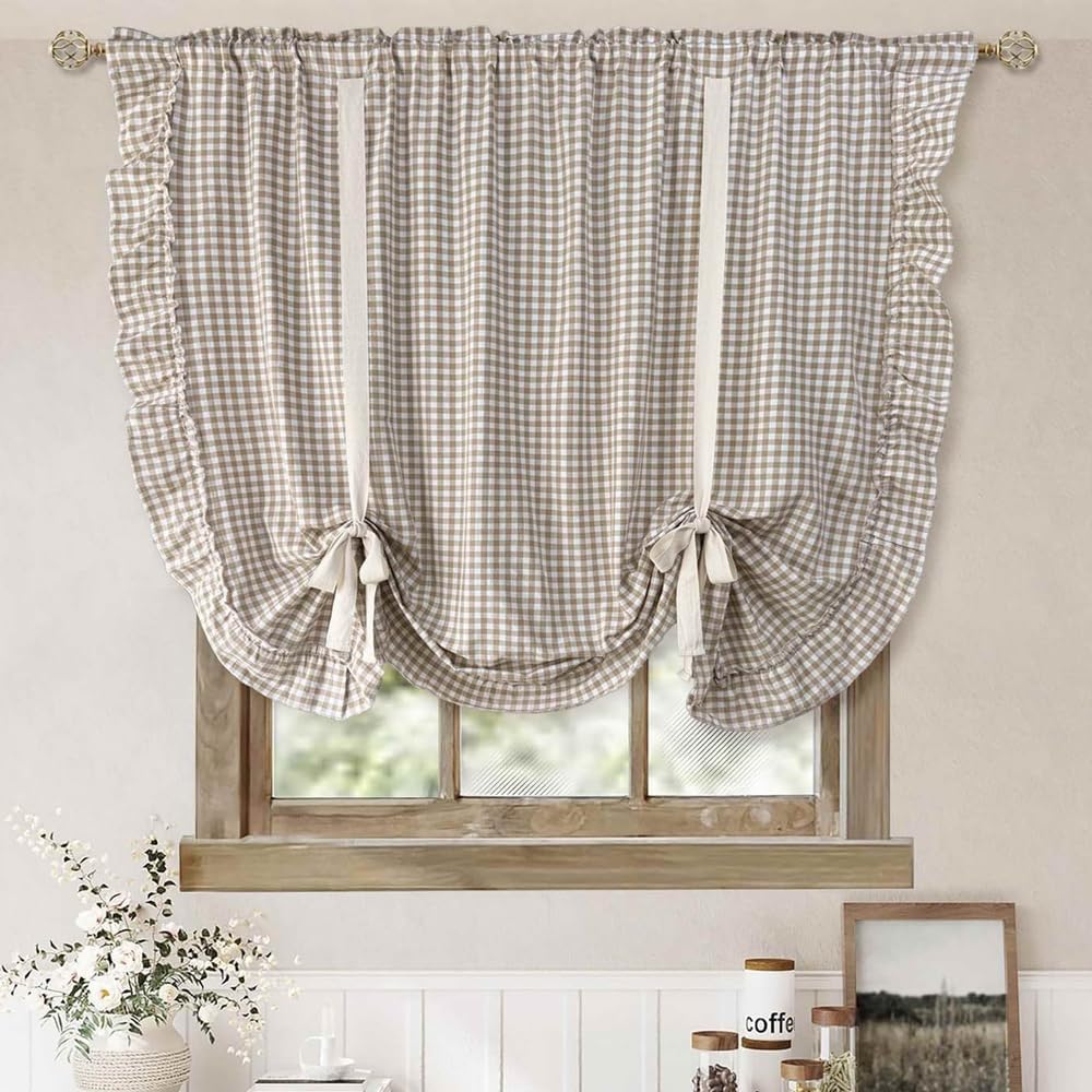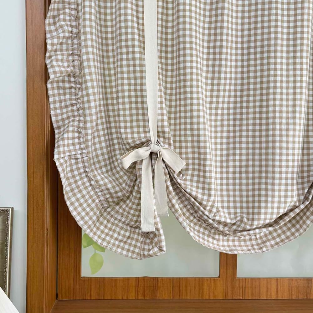 Add a touch of farmhouse charm to your windows with this delightful buffalo check tie-up balloon curtain. The classic light brown and white gingham pattern creates a warm, inviting atmosphere while maintaining a light and airy feel.