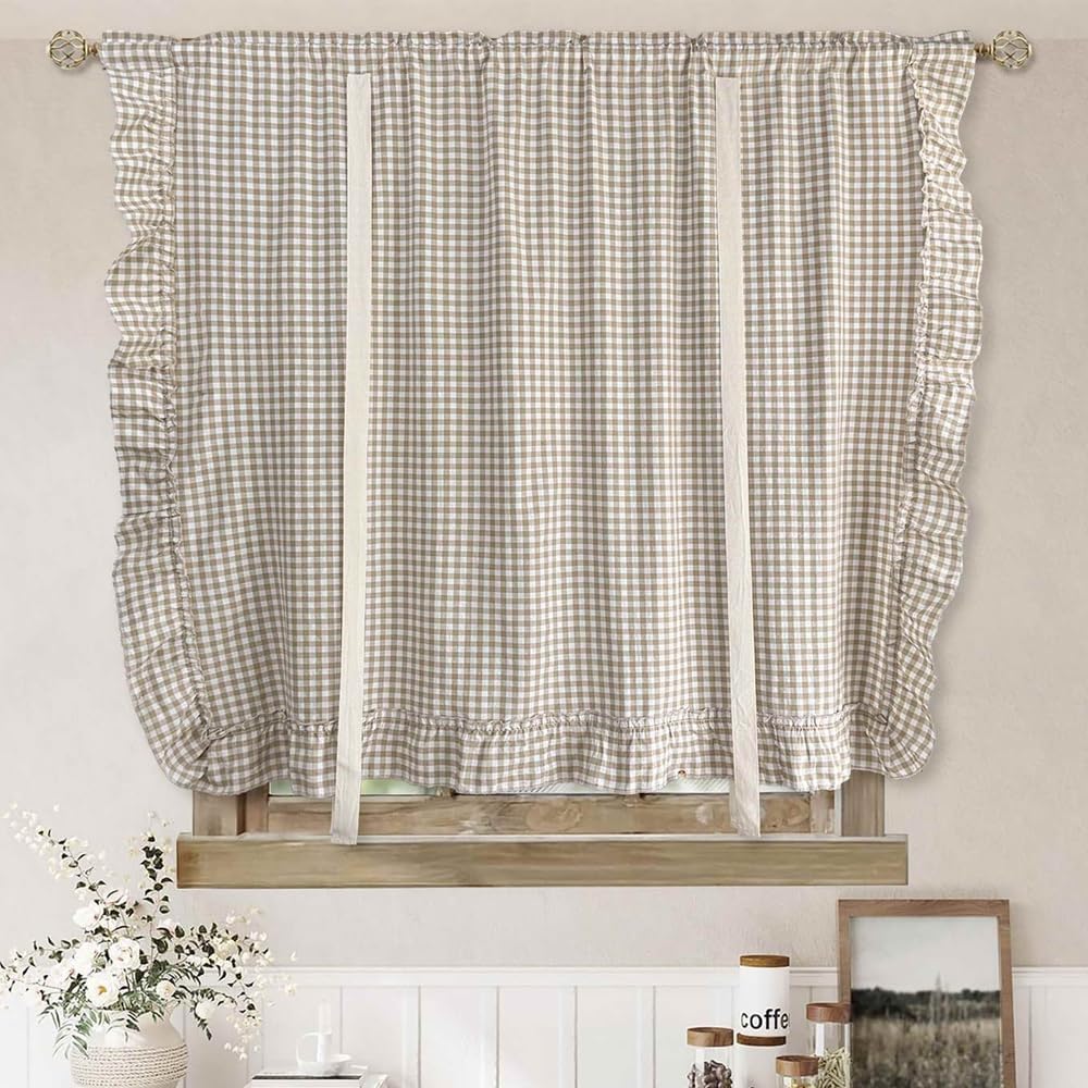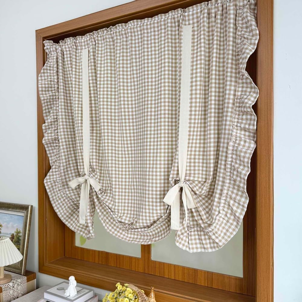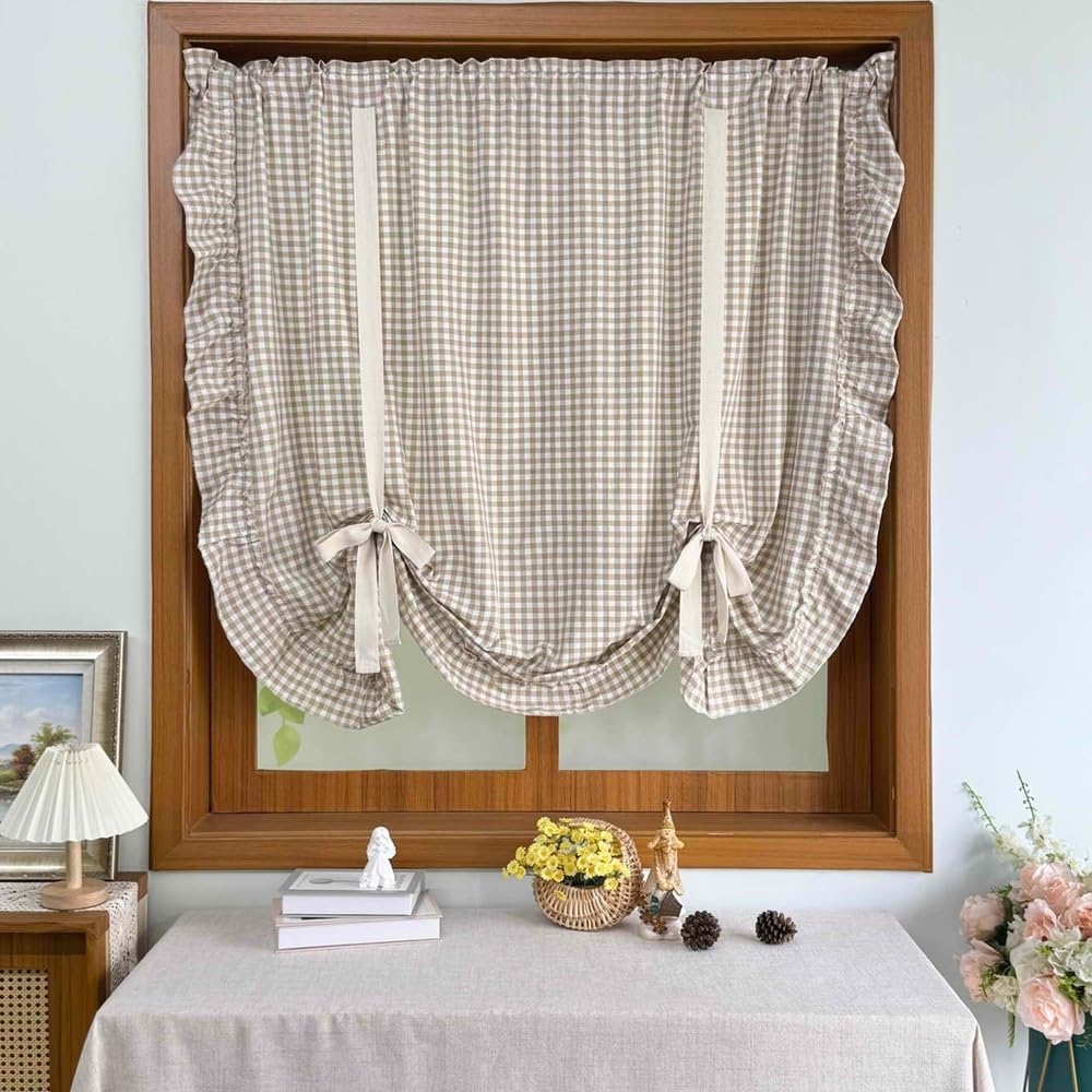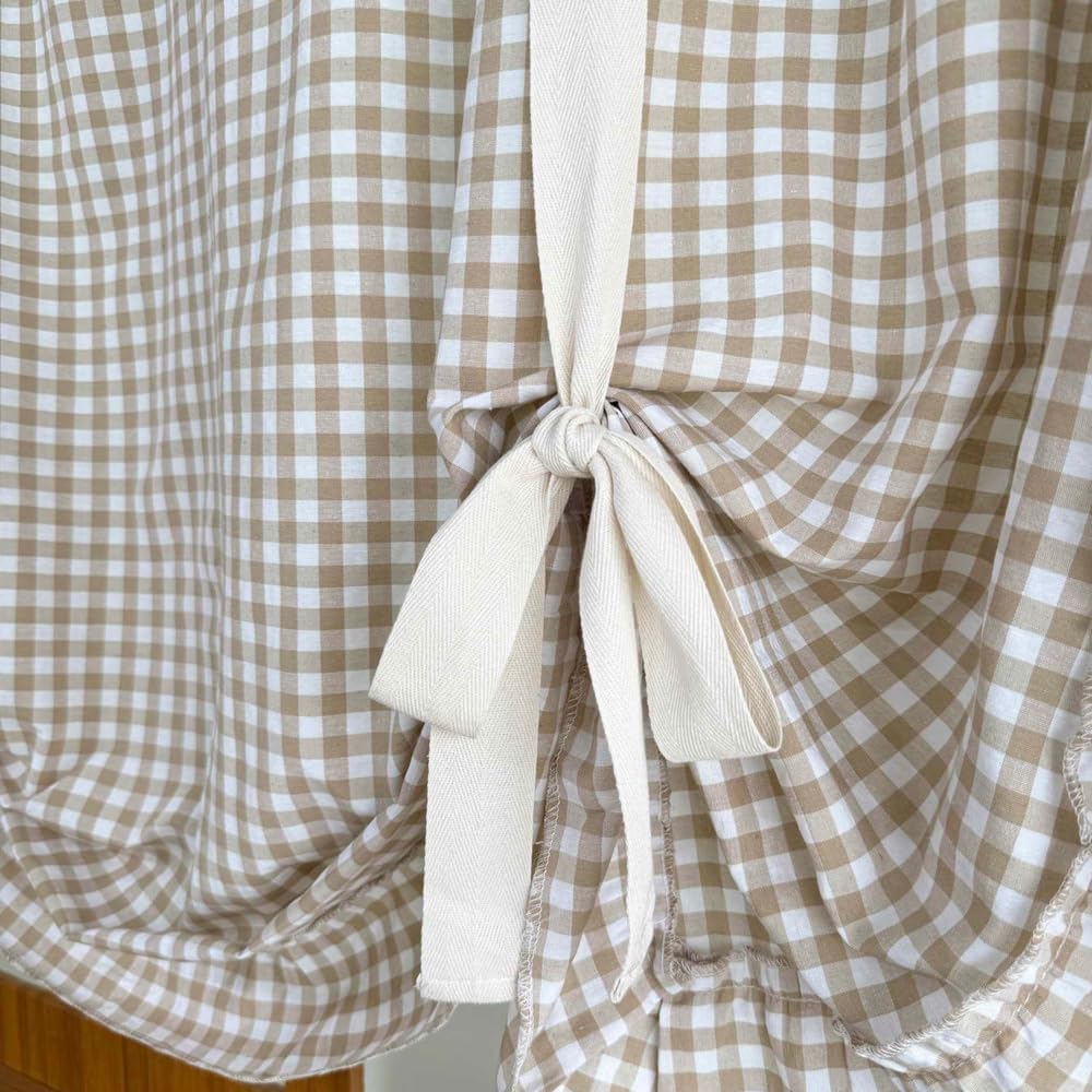 Add a touch of farmhouse charm to your windows with this delightful buffalo check tie-up balloon curtain. The classic light brown and white gingham pattern creates a warm, inviting atmosphere while maintaining a light and airy feel.