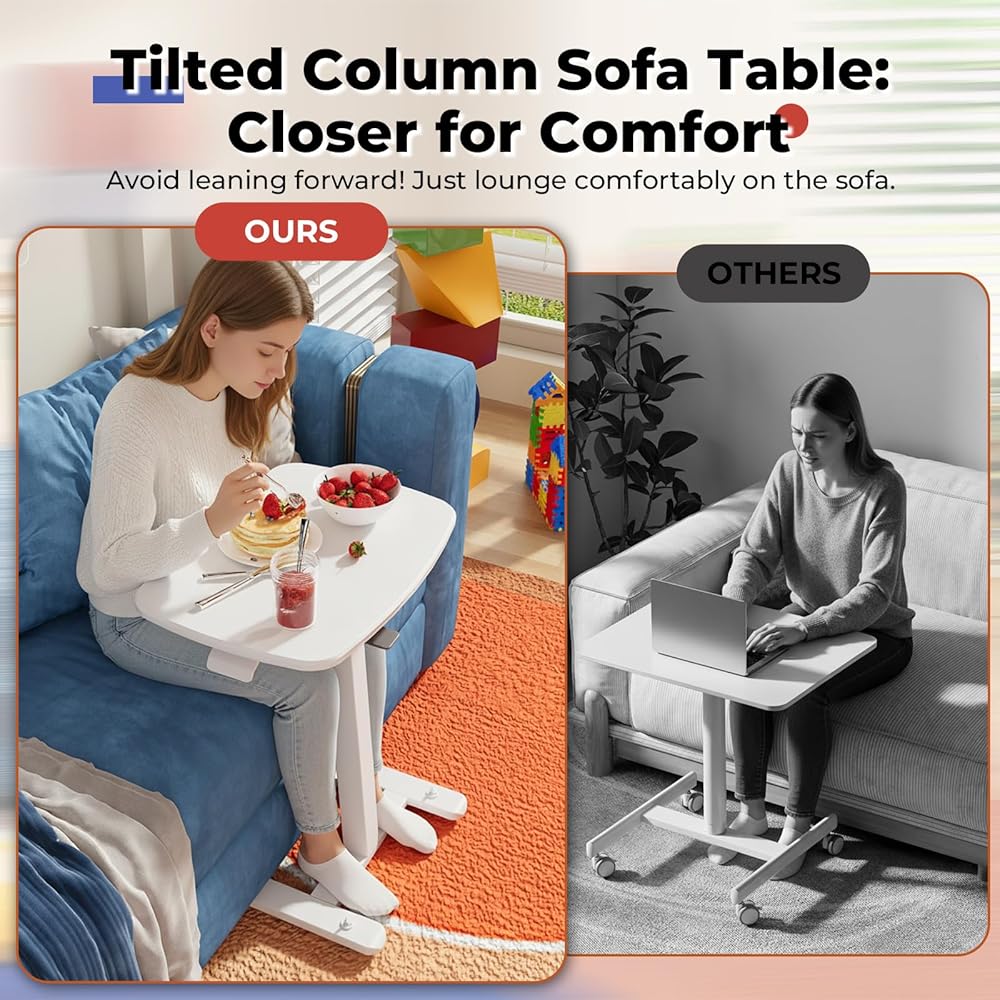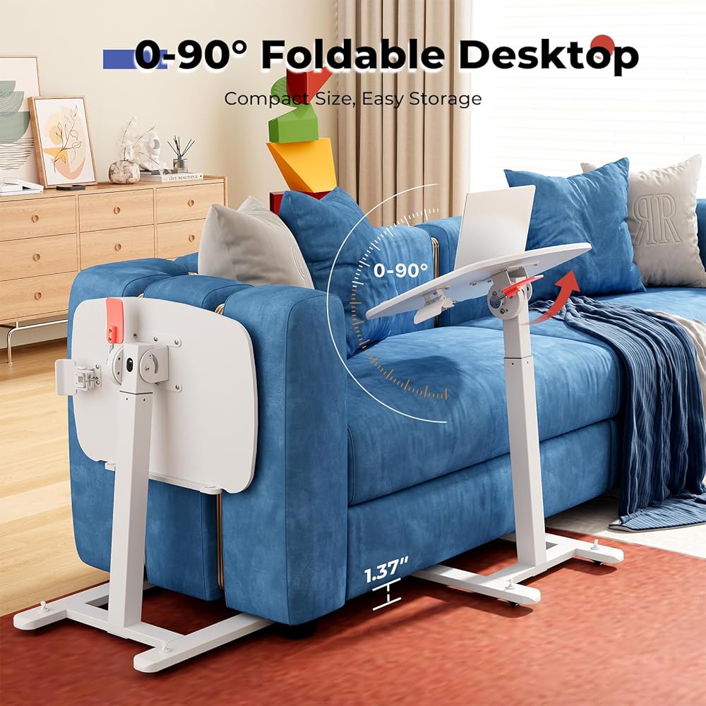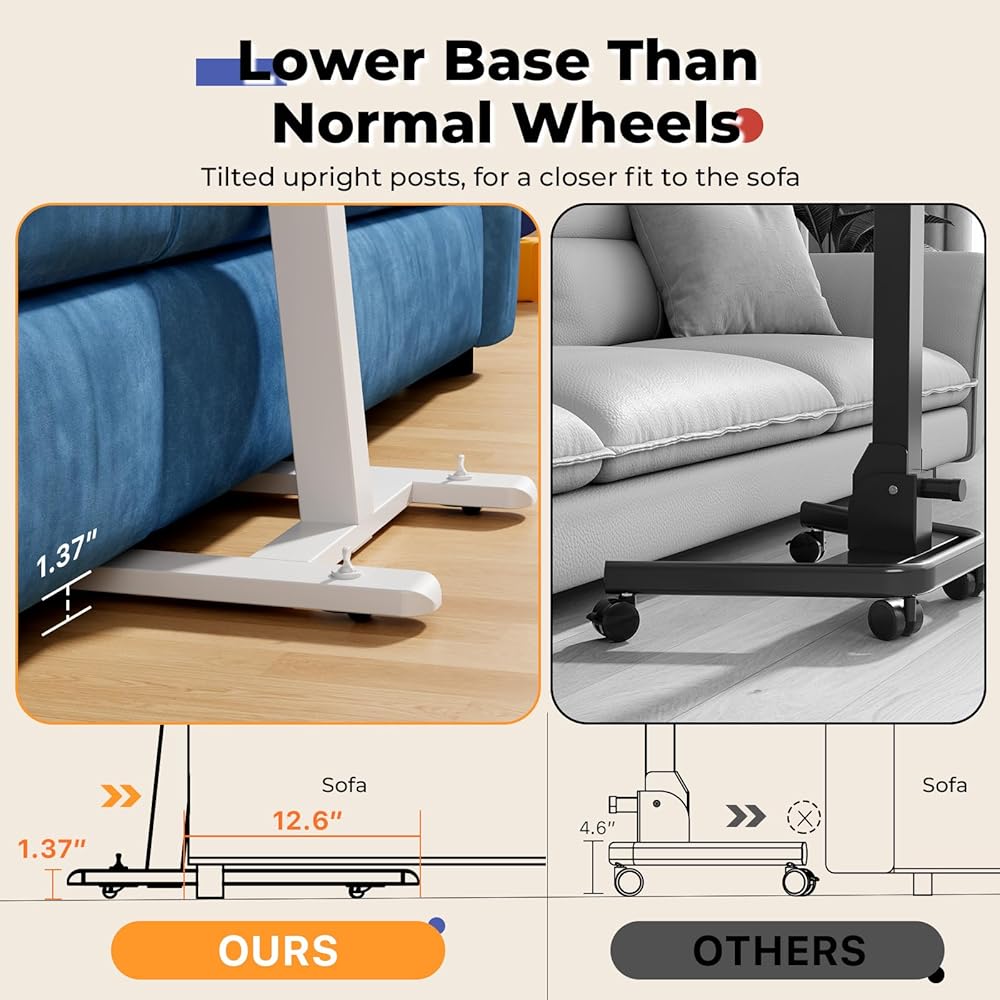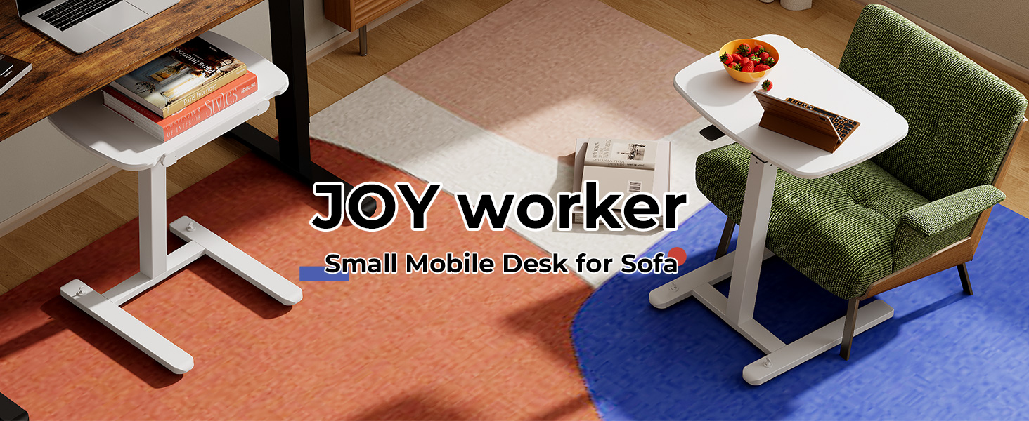JOY Worker مكتب قائم متنقل صغير منخفض الارتفاع للأريكة، طاولة صينية تلفزيون قابلة للتعديل مع سطح مكتب MDF قابل للطي بزاوية 90 درجة، مكتب كمبيوتر محمول محمول مع قاعدة منخفضة وعجلات مخفية قابلة للقفل، أبيض