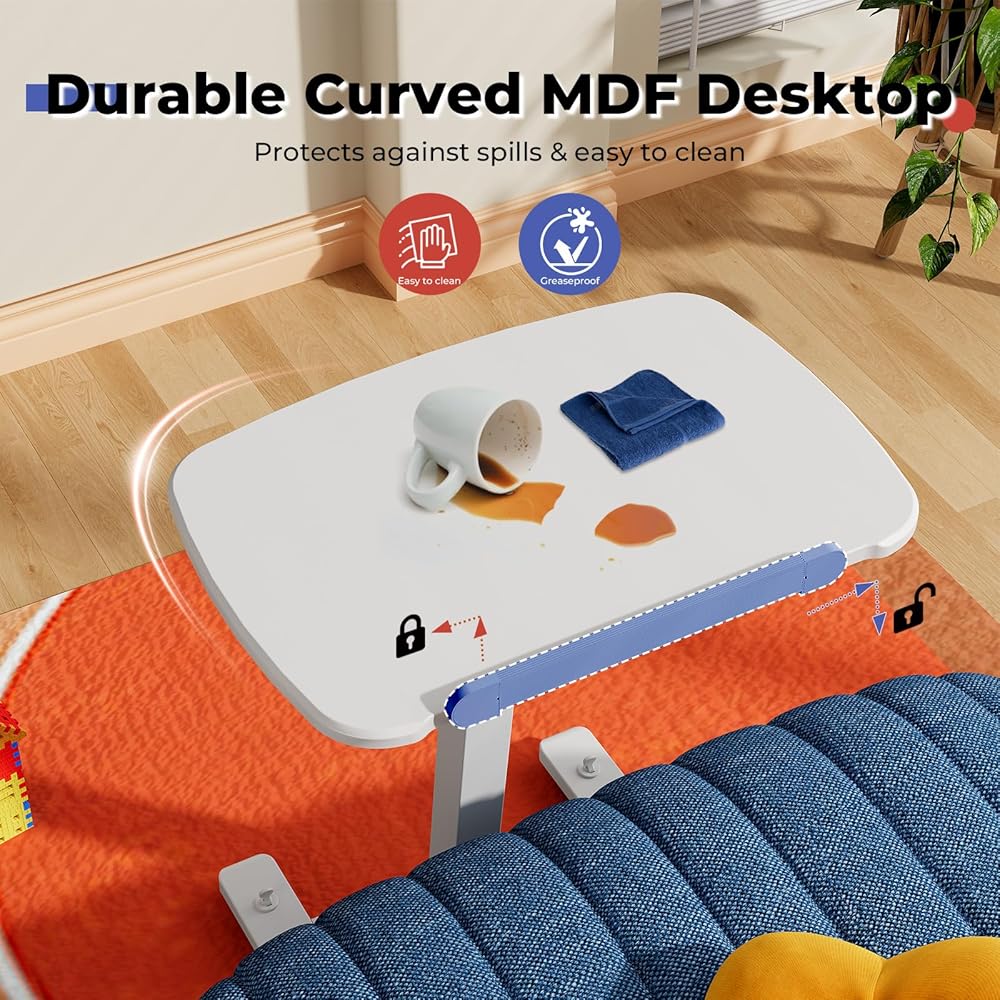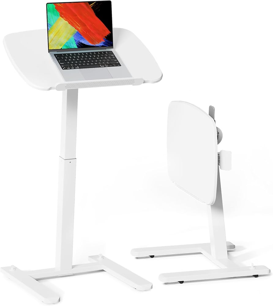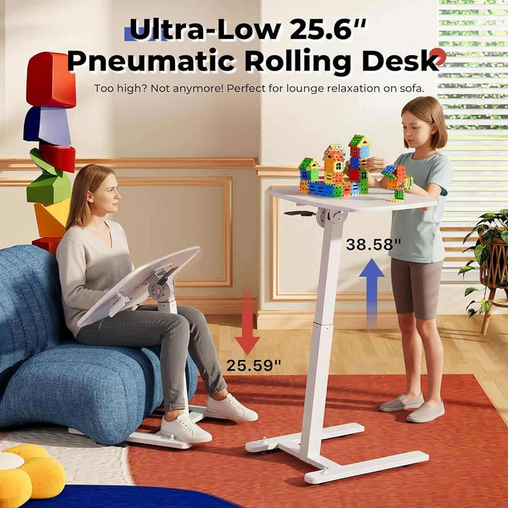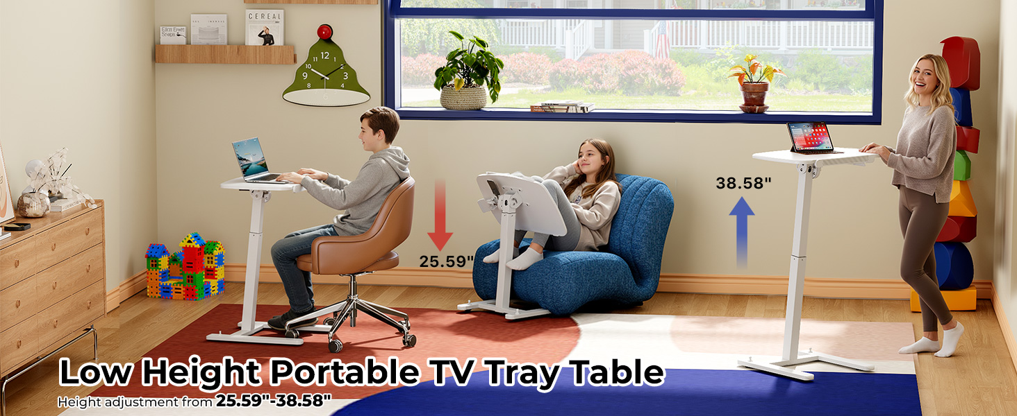 JOY Worker مكتب قائم متنقل صغير منخفض الارتفاع للأريكة، طاولة صينية تلفزيون قابلة للتعديل مع سطح مكتب MDF قابل للطي بزاوية 90 درجة، مكتب كمبيوتر محمول محمول مع قاعدة منخفضة وعجلات مخفية قابلة للقفل، أبيض