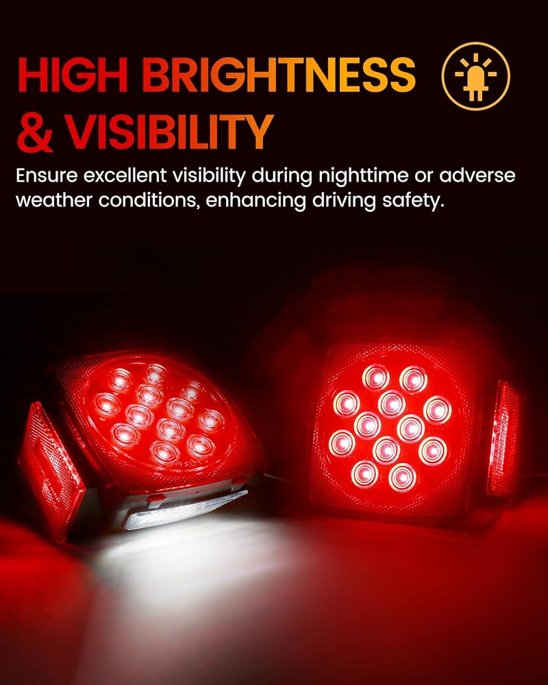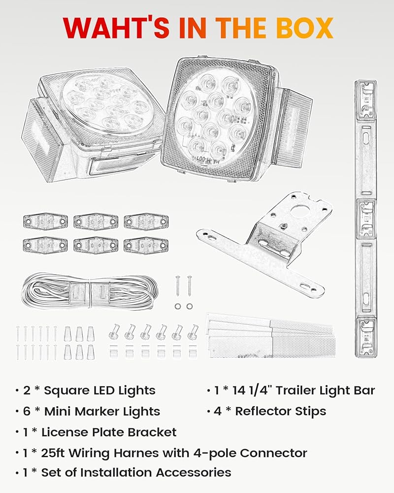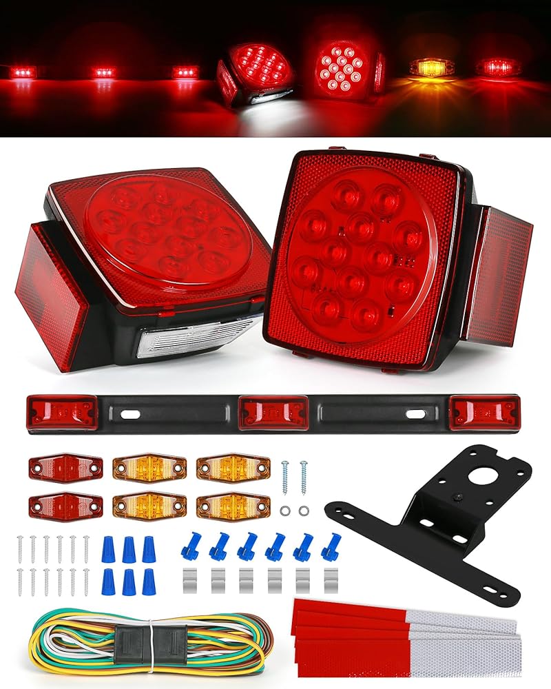مجموعة مصابيح LED للمقطورة الغاطسة - 2x أضواء مربعة للإيقاف/الانعطاف/الفرامل/لوحة الترخيص، شريط ضوء فرامل خلفي مقاس 14.25 بوصة، 6x أضواء علامة صغيرة، حزام أسلاك بطول 25 قدمًا مع موصل بأربعة أقطاب، مجموعة تثبيت