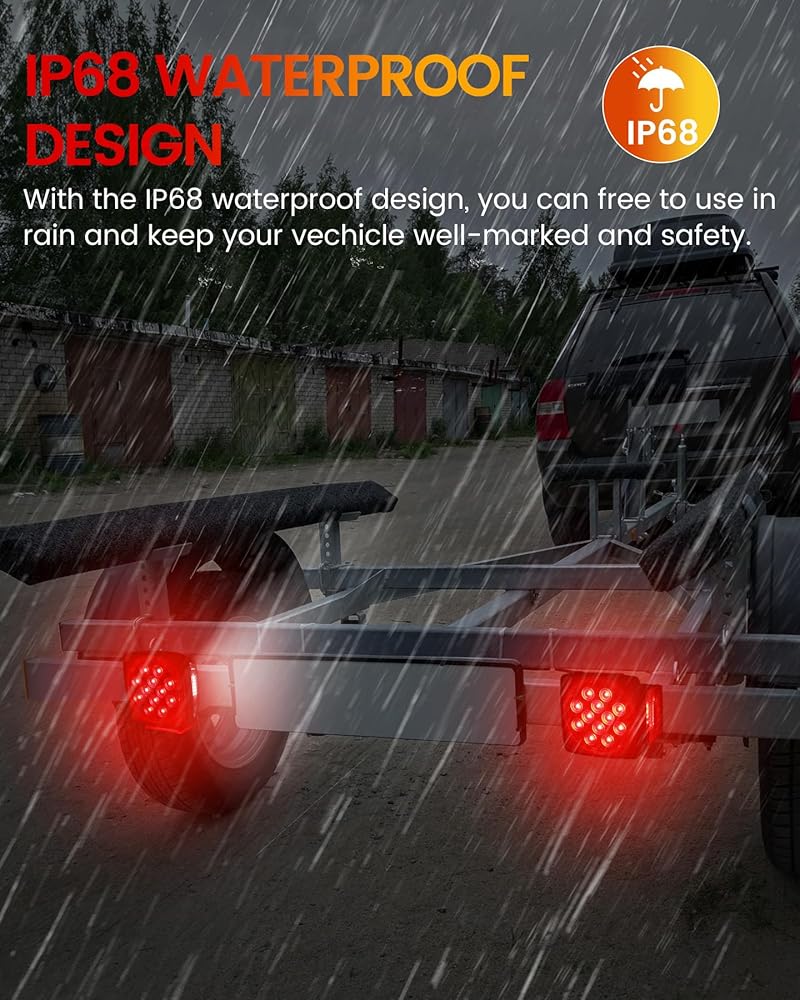 • مقاومة للماء IP68: تتمتع المصابيح المربعة الرئيسية بتصنيف IP68 المقاوم للماء، مما يضمن أنها قابلة للغمر بالكامل ومناسبة للظروف الجوية القاسية، مما يجعلها مثالية للمقطورات والقوارب والشاحنات وشبه المقطورات وشاحنات التفريغ والحافلات وغيرها من المركبات.