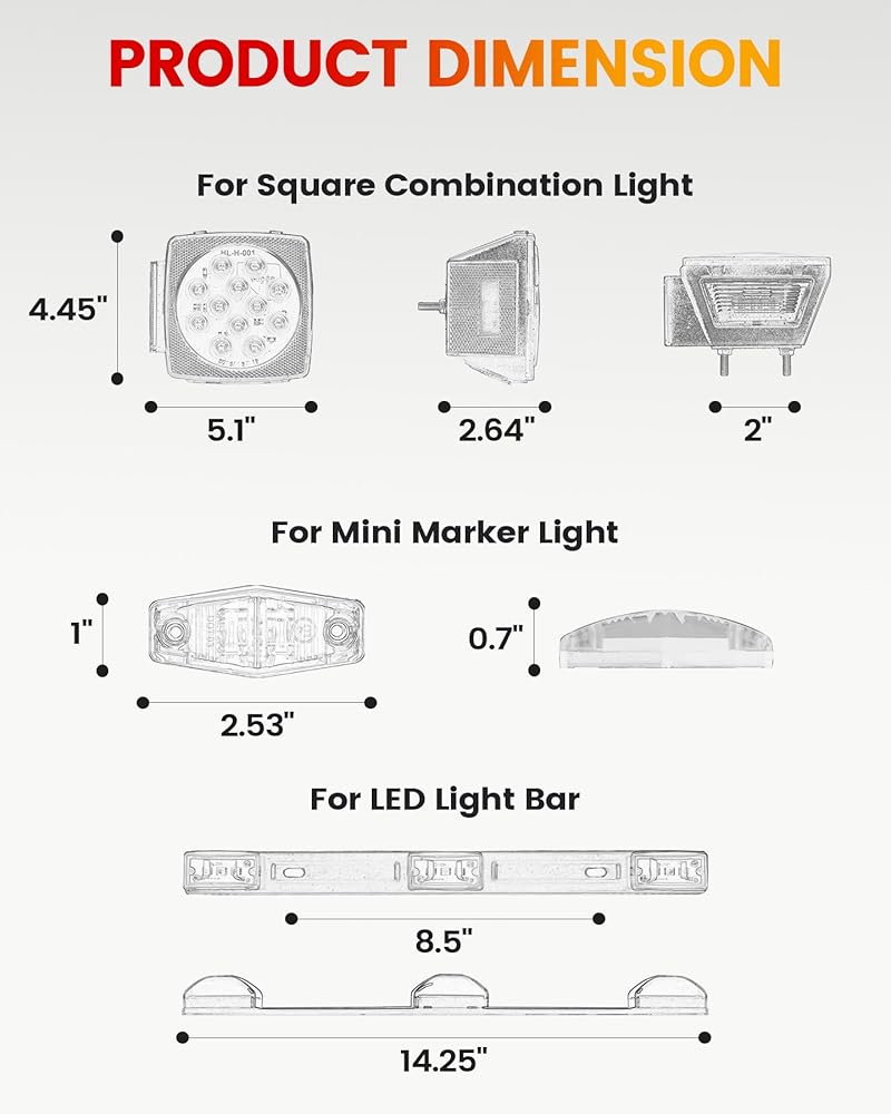 • مجموعة إضاءة شاملة: تتضمن 2x مصابيح توقف مربعة/دوران/ذيل/فرامل/لوحة ترخيص (العرض 5.1 بوصة × الارتفاع 4.45 بوصة × العمق 2.64 بوصة، مسافة مسمار 2 بوصة)، وشريط ضوء فرامل خلفي 14.25 بوصة (مسافة فتحة 8.5 بوصة)، و6 × مصابيح علامة صغيرة (الطول 2.53 بوصة × العرض 1 بوصة × الارتفاع 0.7") لرؤية كاملة للطريق.