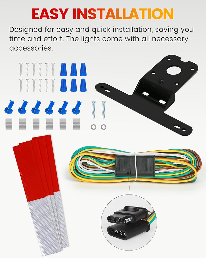 • مجموعة التثبيت الكاملة: تأتي مع سرج أسلاك بطول 25 قدمًا مع موصل ذو 4 أقطاب، وأشرطة عاكسة، ودعامة لوحة الترخيص، وجميع براغي التثبيت الضرورية، مما يوفر كل ما يلزم لإعداد آمن وسهل.