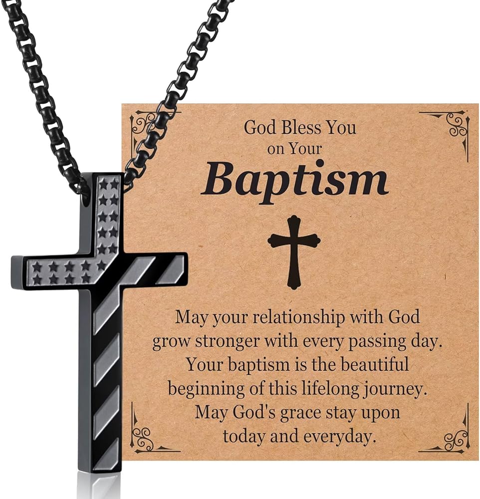 المواد: قلادة هدايا المعمودية للأولاد مصنوعة من حلية متقاطعة من الفولاذ المقاوم للصدأ ومطعمة بنمط العلم الأمريكي، عصرية ومتينة. تصميم أنيق يجعلها هدية يجب اقتناؤها لتزيين قلادة المعمودية للأولاد المراهقين