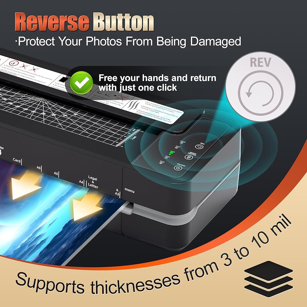 【𝐑𝐄𝐕 𝐒𝐦𝐚𝐫𝐭 𝐉𝐚𝐦-𝐏𝐫𝐞𝐯𝐞𝐧𝐭𝐢𝐨𝐧 & 𝐄𝐚𝐬𝐲 𝐑𝐞𝐯𝐞𝐫𝐬𝐞 𝐅𝐮𝐧𝐜𝐭𝐢𝐨𝐧】قل وداعًا لانحشار الورق المحبط. بفضل نظام REV الذكي الموجود في آلة التغليف الحراري هذه، تعمل ضغطة زر بسيطة على عكس الأسطوانات تلقائيًا لإخراج أي مستند تم تلقيمه بشكل غير صحيح. تحمي هذه الميزة الذكية صورك الثمينة وأعمالك الفنية والمستندات المهمة من التجاعيد والتمزقات، مما يضمن عملية تصفيح سلسة في كل مرة تستخدم فيها جهاز التغليف.