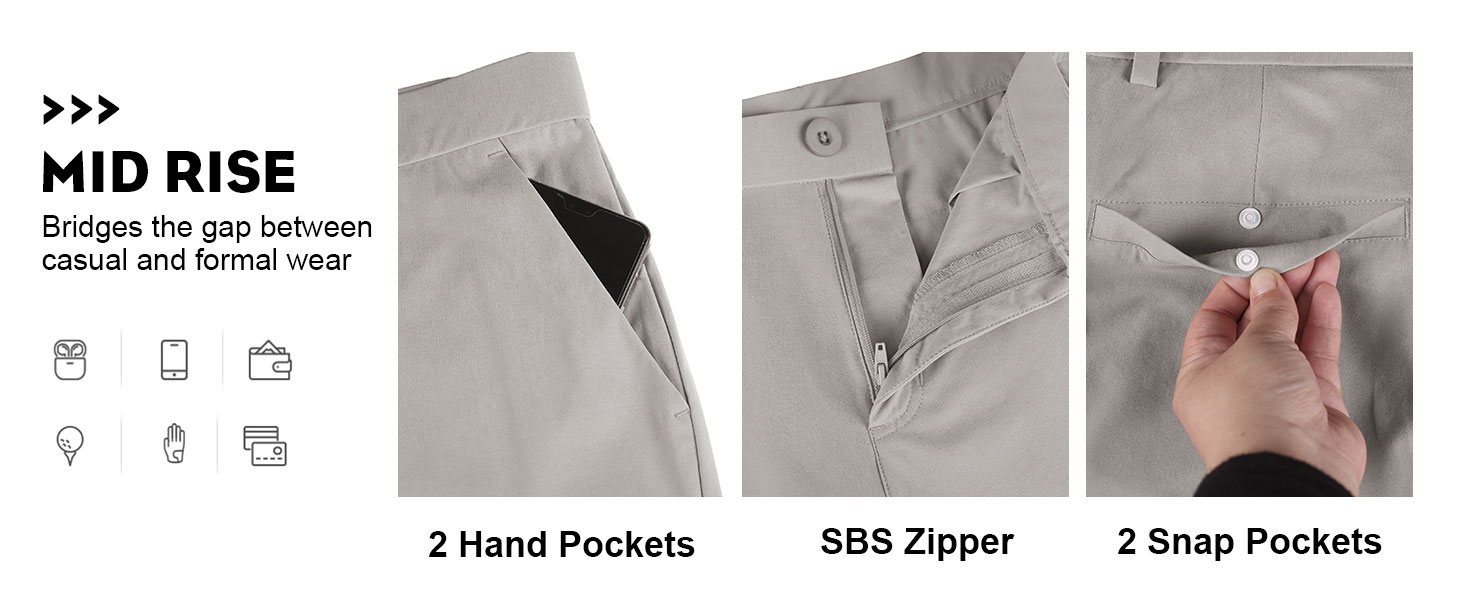 SECURE SNAP-POCKET STORAGE: Designed with the golfer in mind. We upgraded the standard back pockets with secure Snap Buttons to solve the "lost scorecard" problem. These are superior to open pockets for security (keeping wallets safe) and easier to use than traditional small buttons—especially when wearing a golf glove. Includes two deep front slant pockets engineered to hold golf balls and tees without them falling out when you sit in the cart.