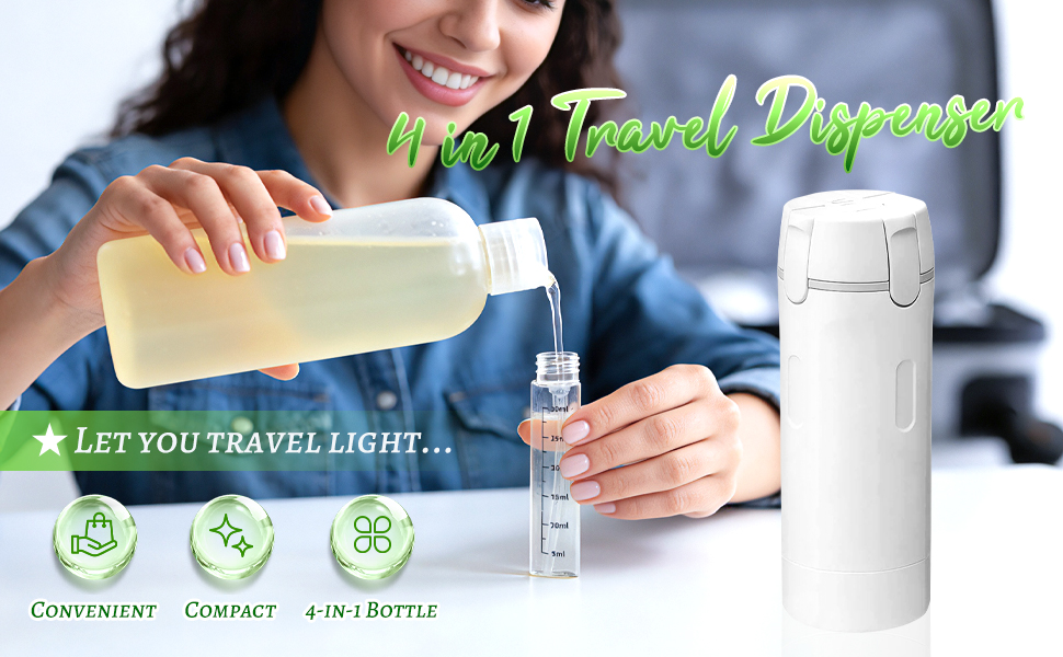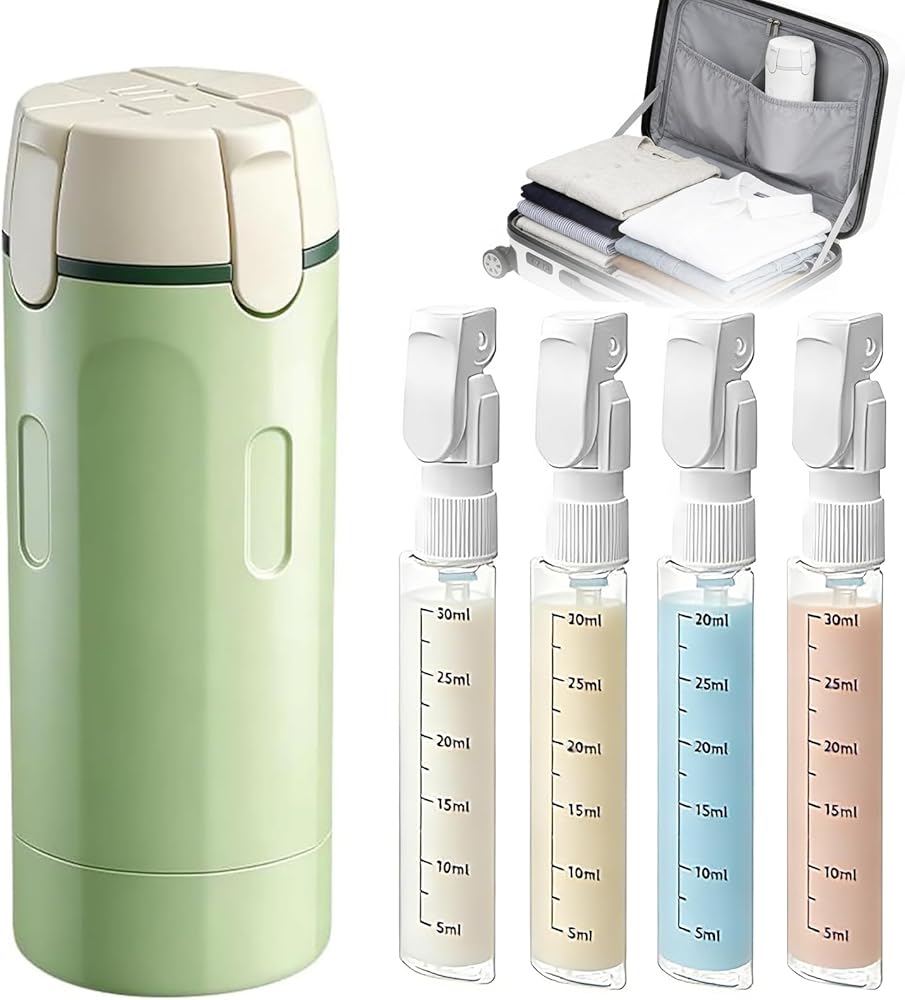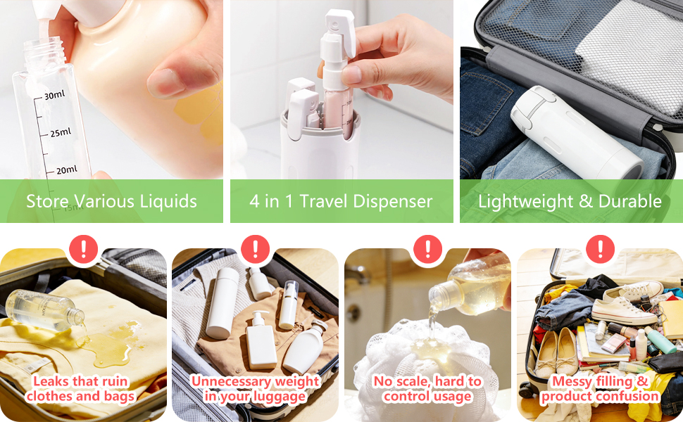 【تقنية موثوقة مانعة للتسرب 】سافر بثقة بفضل التصميم المضاد للتسرب الذي يمنع الانسكابات غير المرغوب فيها. تضمن هذه الزجاجات القابلة لإعادة التعبئة 4 في 1 رحلات خالية من القلق.