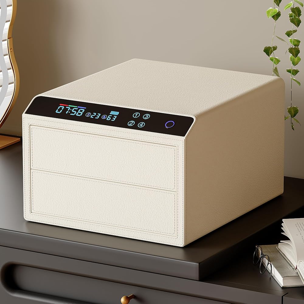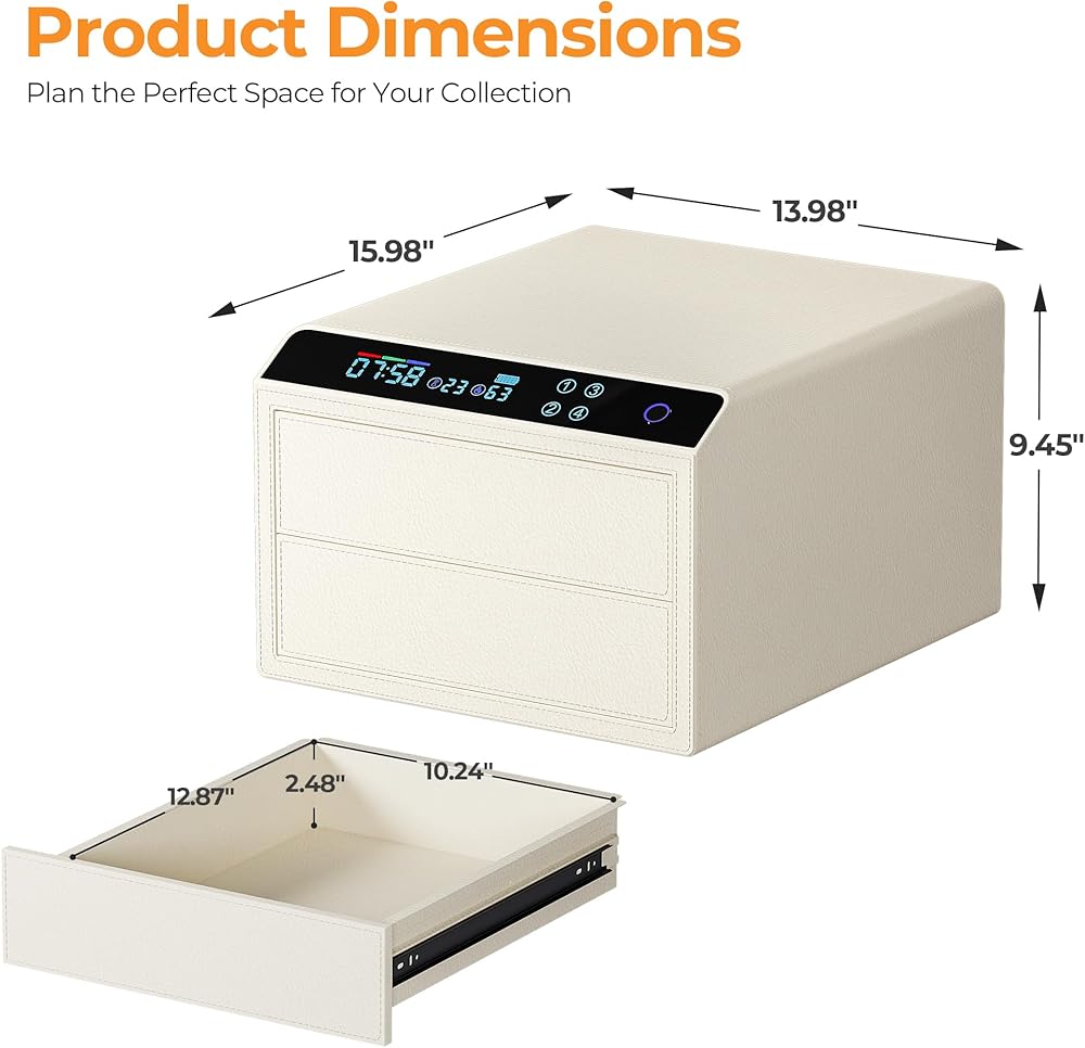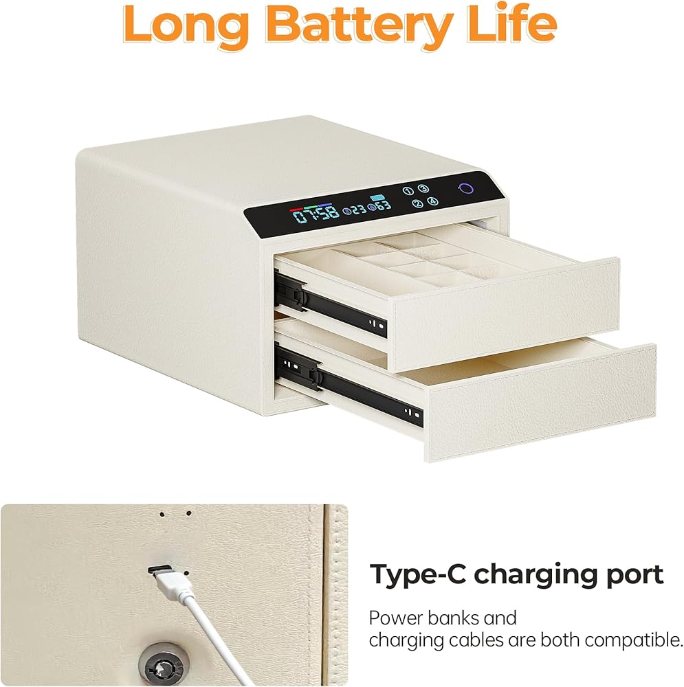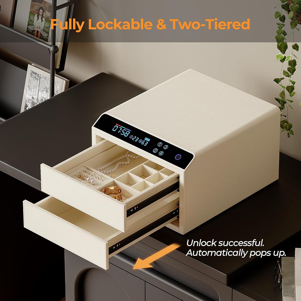 Elevate your jewelry storage with this sophisticated dual-drawer organizer featuring cutting-edge security. Measuring 15.98 x 13.98 x 9.45 inches, this spacious jewelry box offers four smart unlocking methods: fingerprint recognition, six-digit passcode, emergency key, and convenient phone unlocking capability. The two-tiered design includes organized compartments perfect for storing necklaces, rings, bracelets, watches, and other precious accessories. The top drawer dimensions of 12.87 x 10.24 x 2.48 inches provide ample space for larger items, while the automatic pop-up feature ensures smooth access to your collection. The sleek white exterior complements any decor, and the digital display adds a modern touch. This jewelry box combines security with style, making it an ideal solution for protecting and organizing your valuable accessories. The multiple unlocking options ensure you'll never be locked out of your collection, while the thoughtful compartment design keeps everything perfectly arranged and easily accessible.