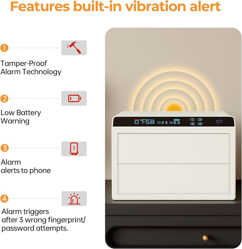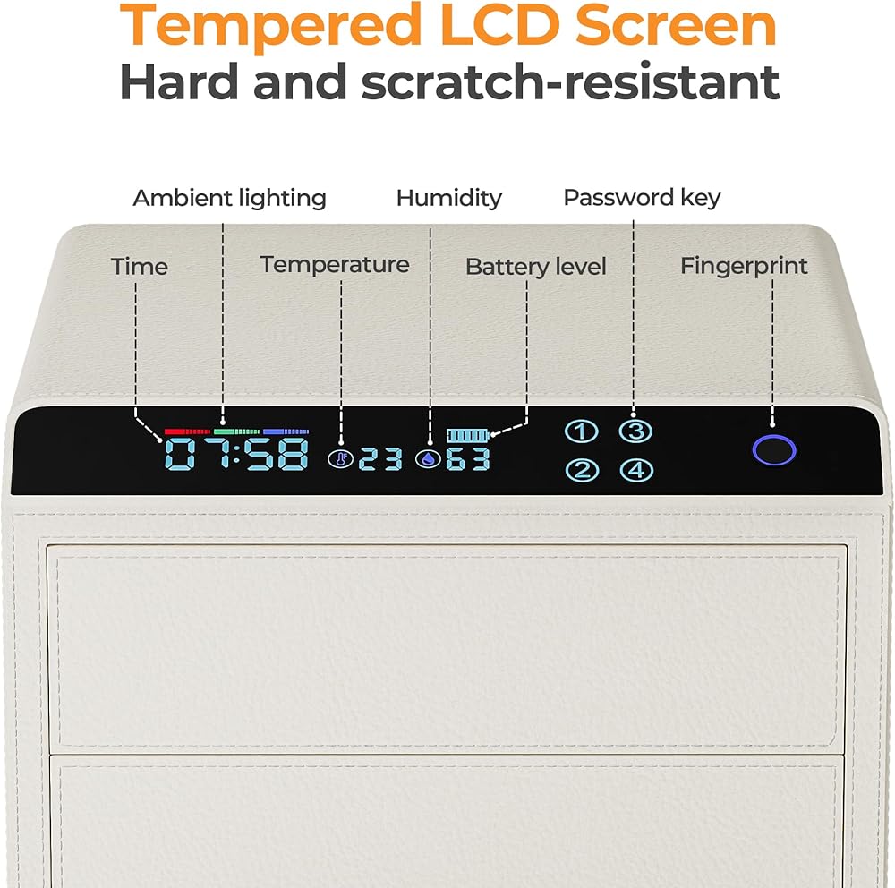 (DOUBLE SAFE UNLOCK - FINGERPRINT & PASSWORD PROTECTION)Equipped with high-sensitivity fingerprint recognition and independent password lock. Fast fingerprint identification in 0.5s, anti-theft and anti-pry design effectively protects your precious jewelry, watches and personal valuables from loss.