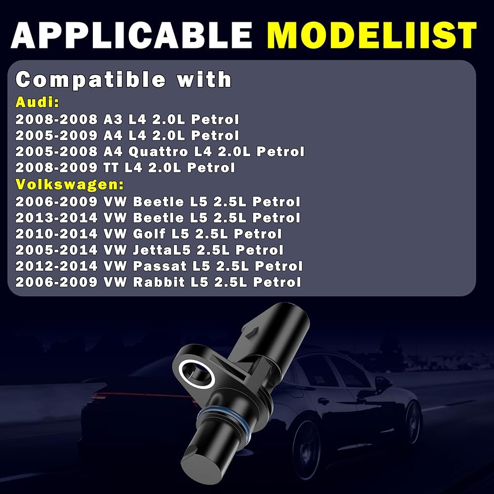 [تركيب السيارة]: مستشعر موضع عمود الكامات متوافق مع Volkswagen VW Jetta 2005 2006 2007 2008 2009 2010 2011 2012 2013 2014، Beetle 2006-2009 & 2013-2014، Golf 2010-2014، Passat 2012-2014، أرنب 2006-2009، يناسب بنزين L5 2.5L | مستشعر عمود الكامة متوافق مع Audi A4 2005 2006 2007 2008 2009، A4 Quattro 2005-2008، A3 2008، TT 2008 2009، يناسب L4 2.0L Petrol، ملاحظة: بالنسبة إلى Audi A3 2008، فهو يناسب النموذج الفرعي الأساسي فقط؛ بالنسبة إلى Audi A4 2007-2009، فهو يناسب فقط الطرازات الفرعية Base/Elite/S Line Sport/Trendy، لمزيد من تفاصيل الطراز، يرجى الرجوع إلى الصور والوصف.