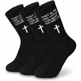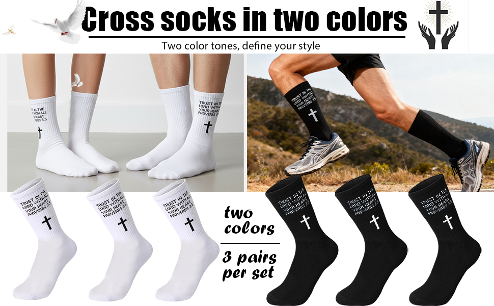 A gift for prayer These socks are in solid black and white, symbolizing purity, innocence, and the sanctity of religious devotion. The white background makes the cross and printed text stand out, while the black enhances the overall spiritual beauty and creates a sense of solemnity when praying.