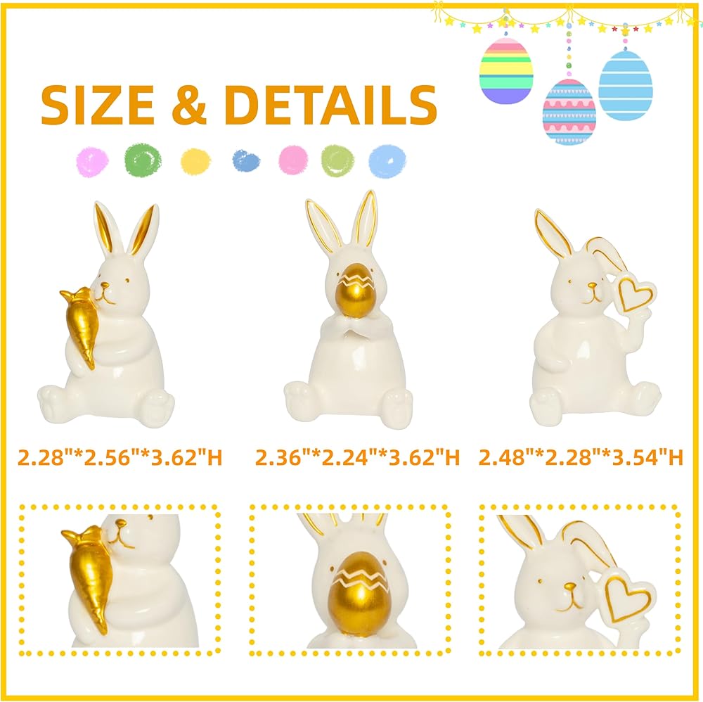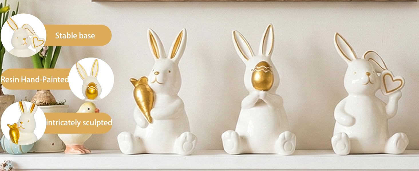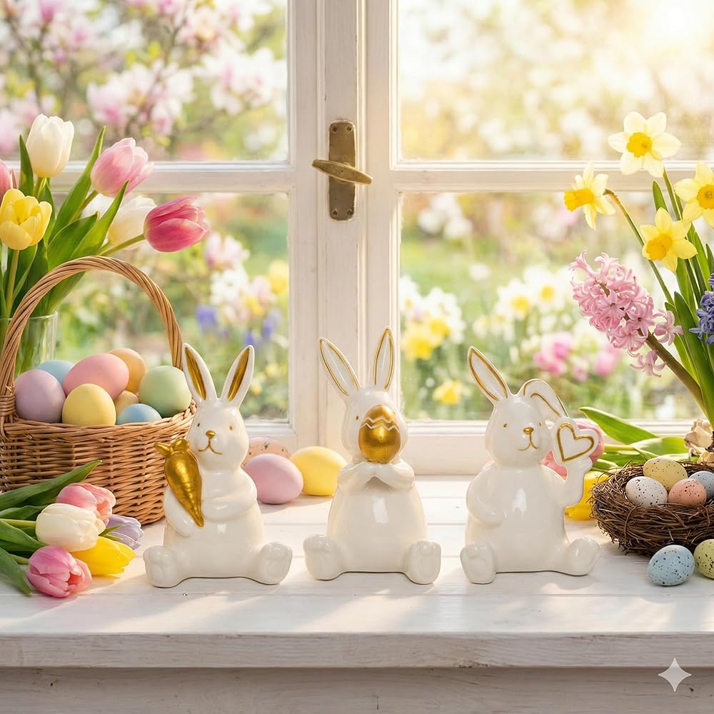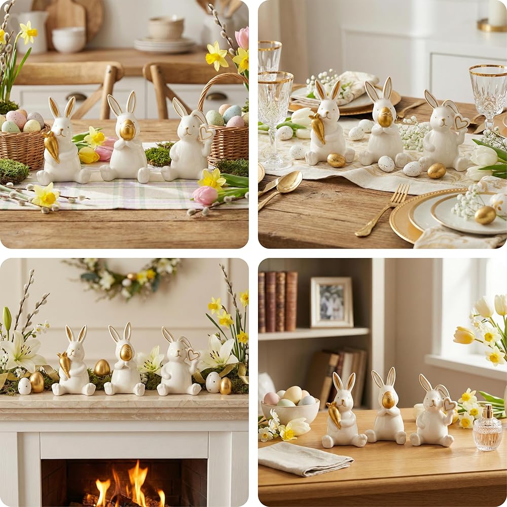 【موضوع عيد الفصح الساحر】يتميز بثلاثة أوضاع مبهجة: أرنب مع جزرة ذهبية محظوظة، وواحد يحتضن بيضة عيد الفصح المنقوشة، وأرنب لطيف ذو أذن مطوية يحمل قلبًا ذهبيًا. يضيف البورسلين الأبيض الأنيق مع لمسات ذهبية فاخرة لمسة من النزوة العصرية إلى ديكور الربيع الخاص بك.