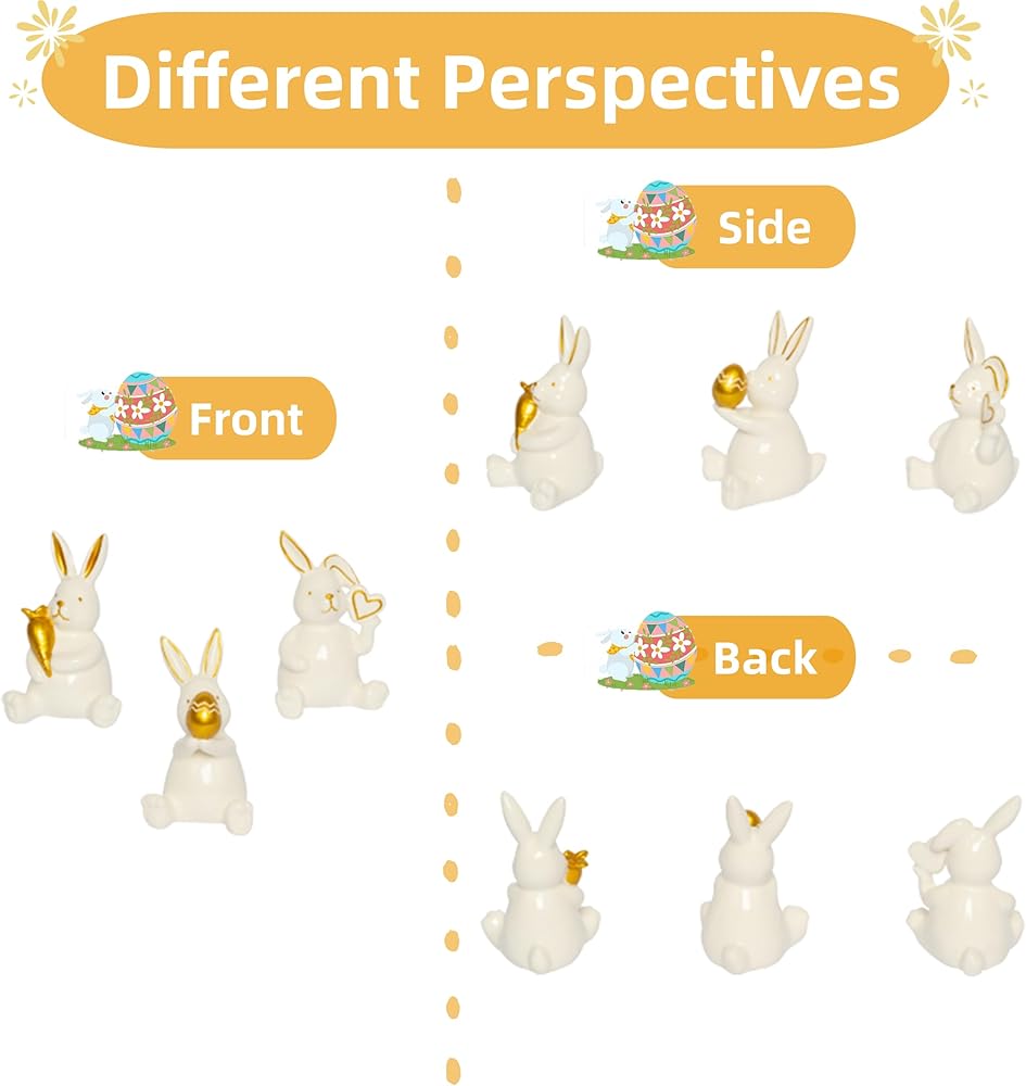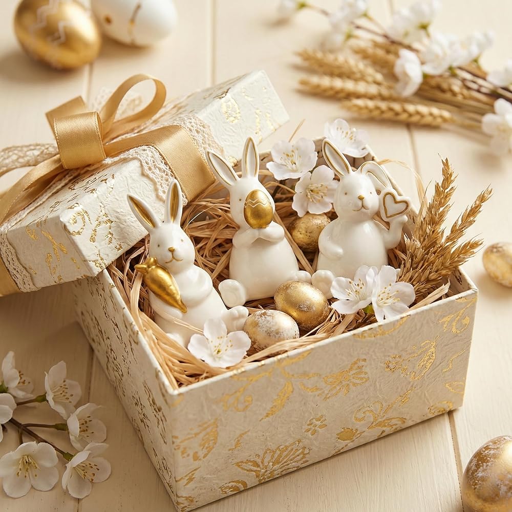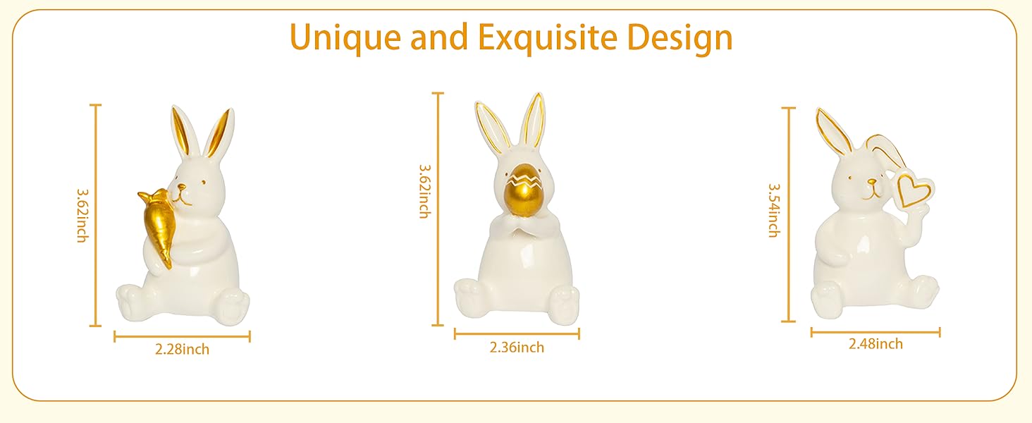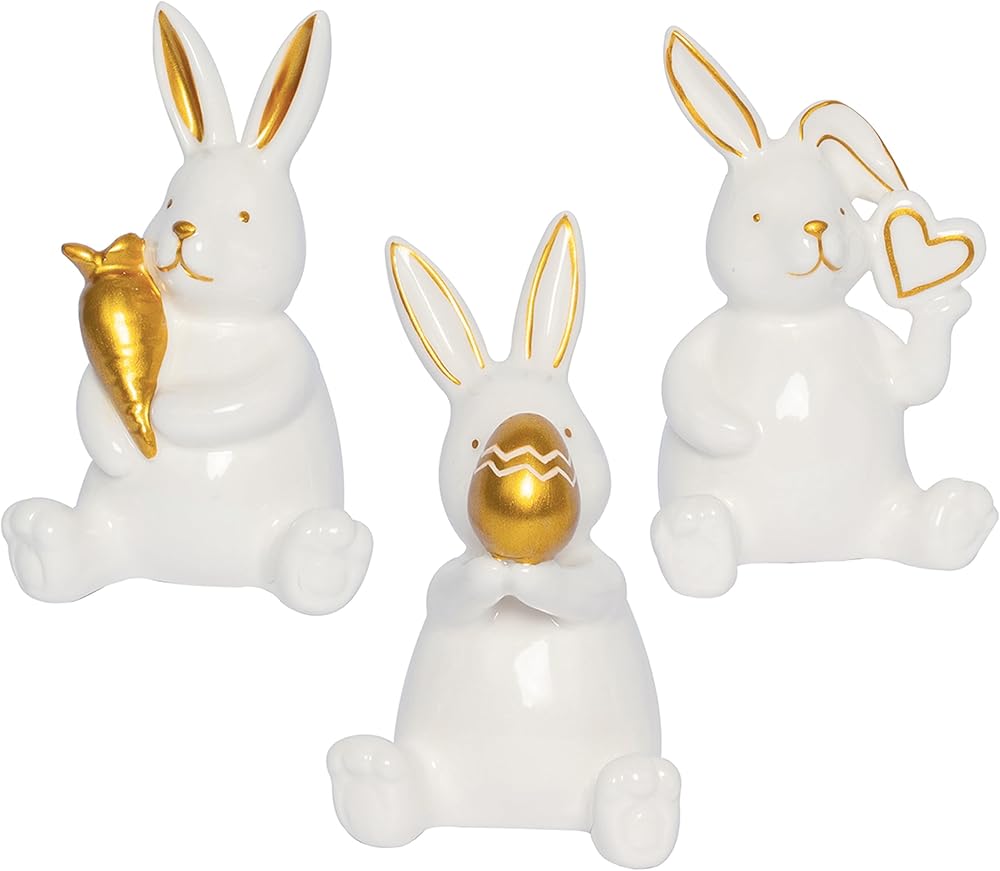 【موضوع عيد الفصح الساحر】يتميز بثلاثة أوضاع مبهجة: أرنب مع جزرة ذهبية محظوظة، وواحد يحتضن بيضة عيد الفصح المنقوشة، وأرنب لطيف ذو أذن مطوية يحمل قلبًا ذهبيًا. يضيف البورسلين الأبيض الأنيق مع لمسات ذهبية فاخرة لمسة من النزوة العصرية إلى ديكور الربيع الخاص بك.