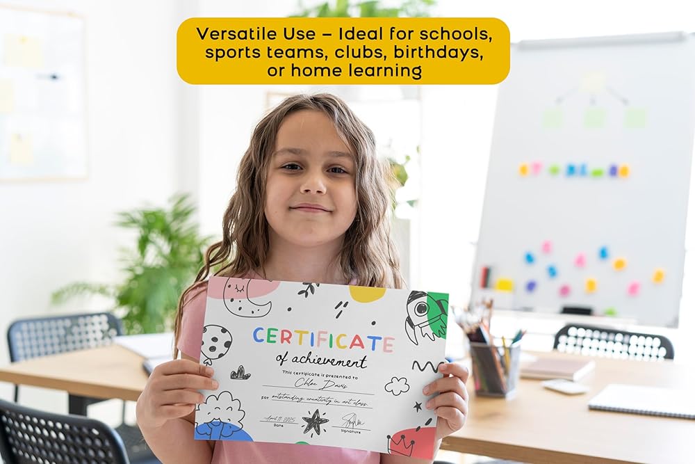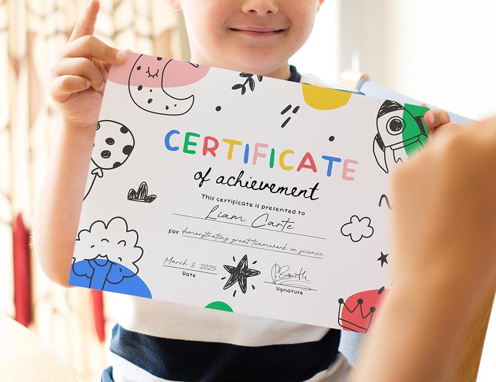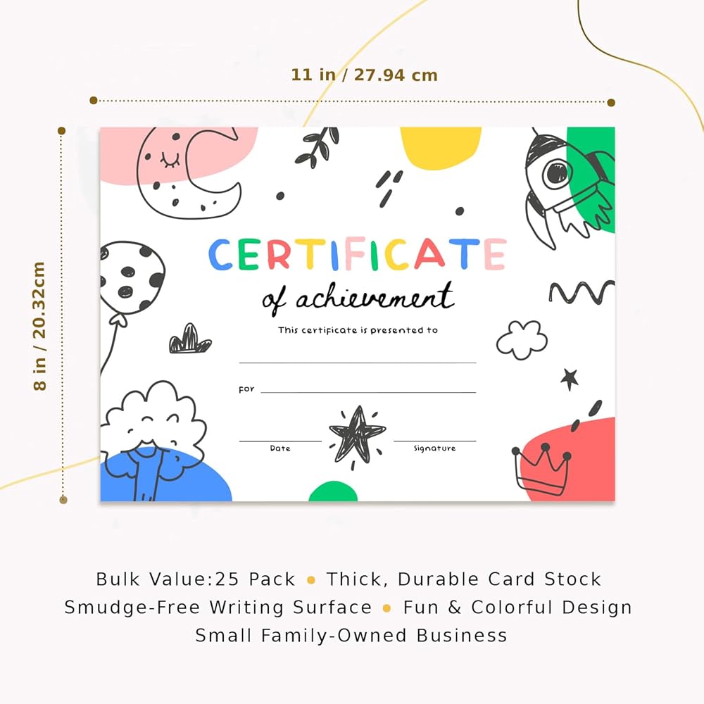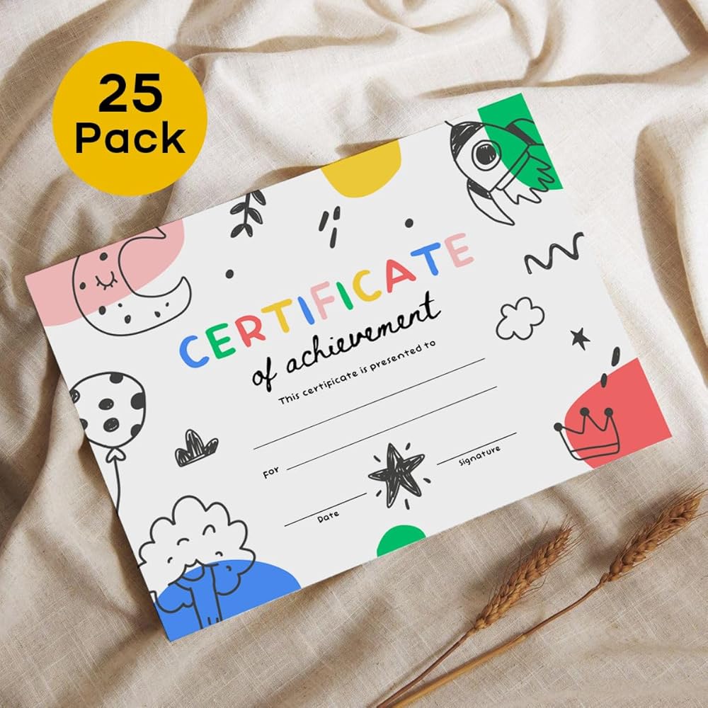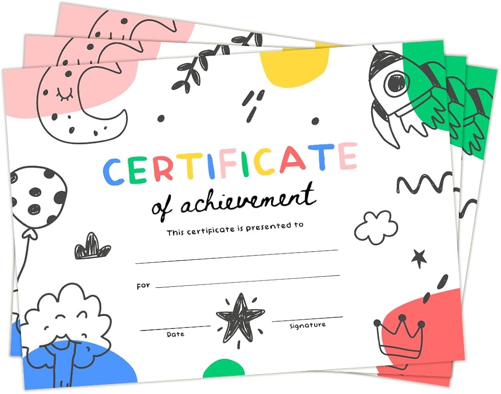 احتفال بالإنجاز: يتضمن 25 "شهادة إنجاز للأطفال" ملونة، مثالية لتقدير الطلاب في مرحلة ما قبل المدرسة أو رياض الأطفال أو جوائز الفصل الدراسي. رائعة للتخرج وأحداث نهاية العام وتقدير الطلاب.