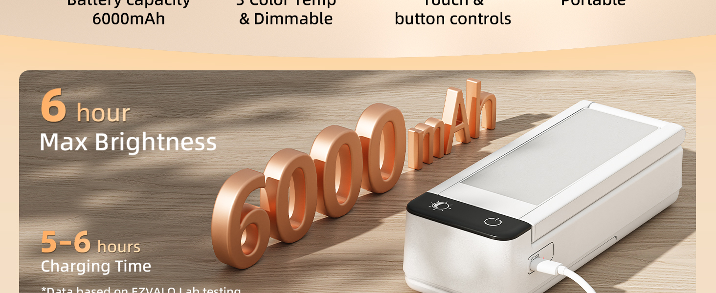مصباح مكتبي قابل لإعادة الشحن يدوم طويلاً: مزود ببطارية قابلة لإعادة الشحن بقدرة 6000 مللي أمبير في الساعة، يوفر هذا المصباح المكتبي اللاسلكي ما يصل إلى 6 ساعات من الإضاءة المستمرة بأقصى سطوع عند الشحن الكامل. إنه المصباح المثالي للقراءة وحل الألغاز وفن الأظافر وصياغة المشاريع، مما يوفر إضاءة لاسلكية موثوقة أينما كنت في حاجة إليها. مثالية للإضاءة في حالات الطوارئ أو للاستخدام في حالات انقطاع التيار الكهربائي.