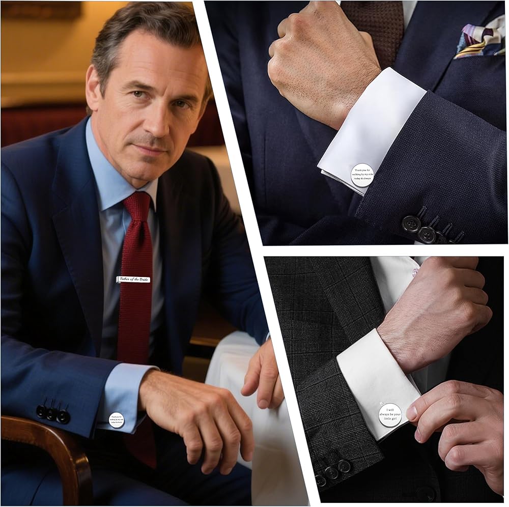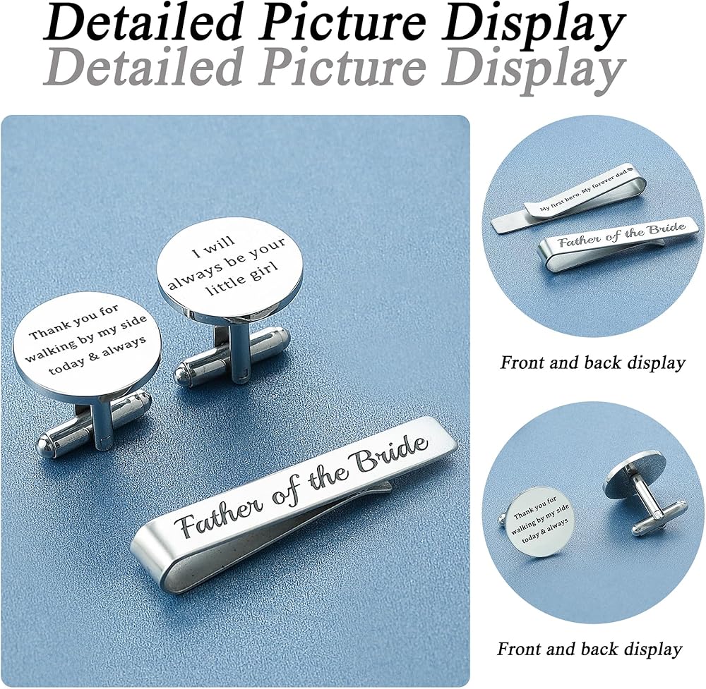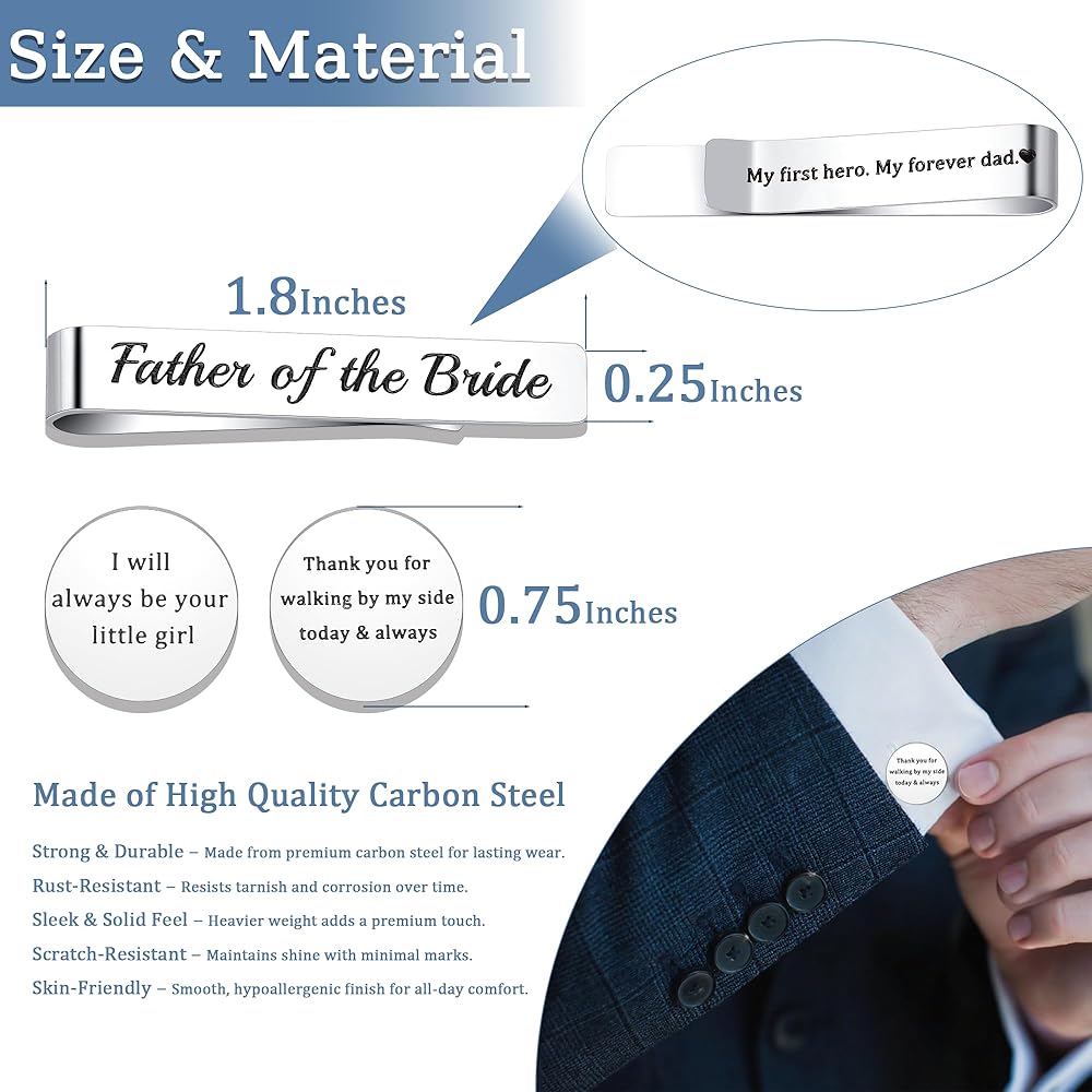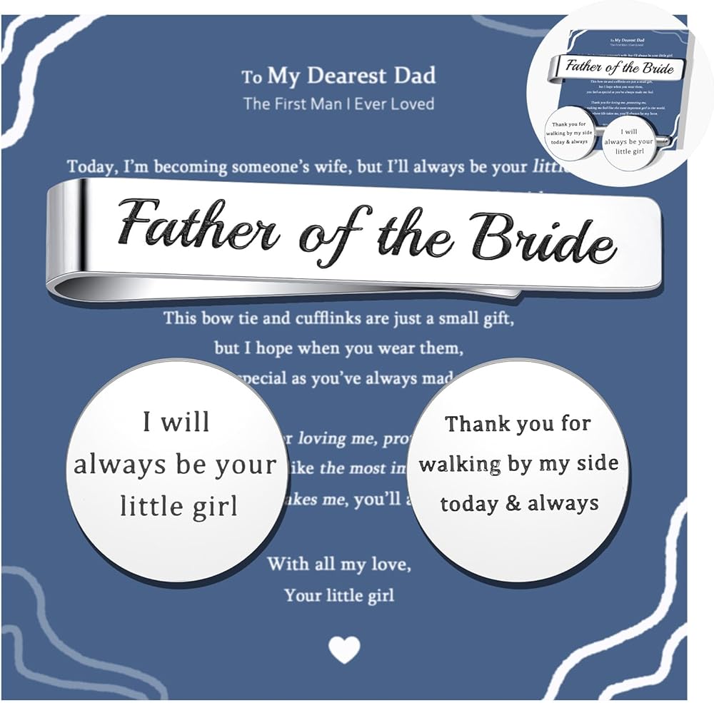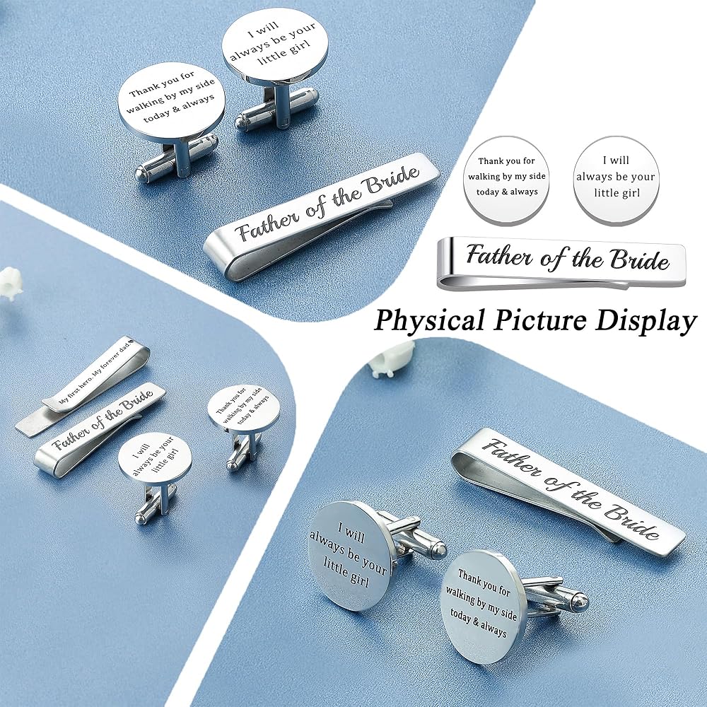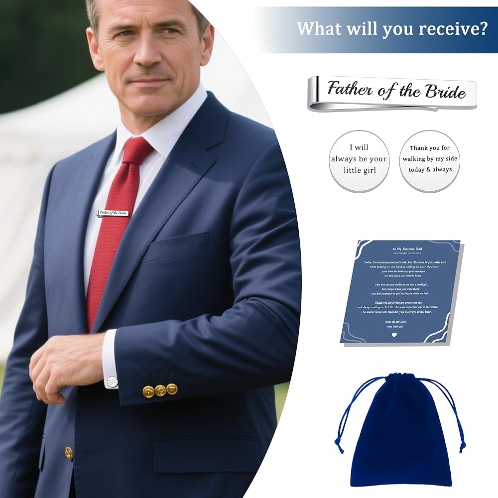 This elegant gift set of a tie clip and matching cufflinks is a heartfelt tribute from a daughter to her father, expressing deep gratitude, love, and the promise of lifelong companionship. The tie clip, engraved with “Father of the Bride,” honors his significant role on her wedding day, commemorating the emotional moment when he walks her into a new life chapter. Together, the set serves as a silent yet powerful thank-you for his years of unwavering support and a gentle reminder of their enduring bond. Ideal for the wedding day, rehearsal dinner, or family celebrations, it also makes a thoughtful present for Father's Day, birthdays, or personal milestones. Suitable for biological fathers, stepfathers, or father figures who have accompanied the bride through life, this set allows him to feel her love, gratitude, and pride. More than just stylish accessories, they symbolize unbreakable connections and create lasting memories, making them a timeless, meaningful, and touching gift.