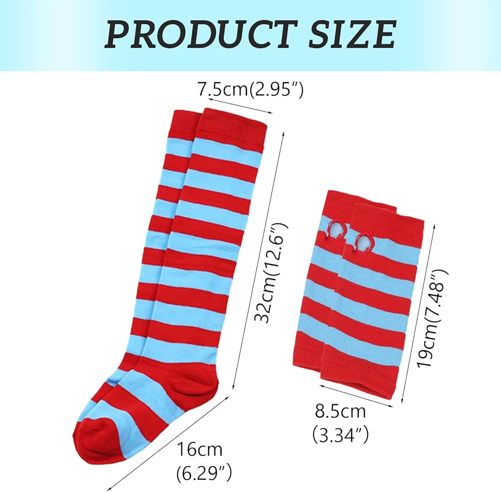 • Striped knee socks and arm warmer: Red Blue striped arm warmer gloves and socks are made of polyester cotton material, soft, breathable and elastic. Glove size is 11.8 x 3.1 inch,socks size is 23.6 x 3.1 inch.Fine stitching and good elasticity,Suitable for most girls