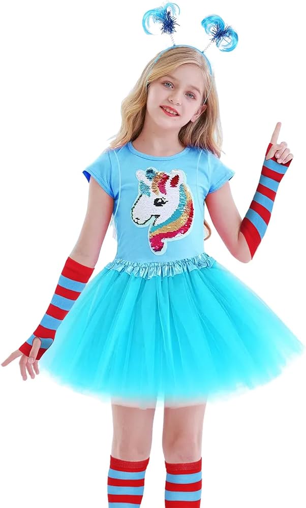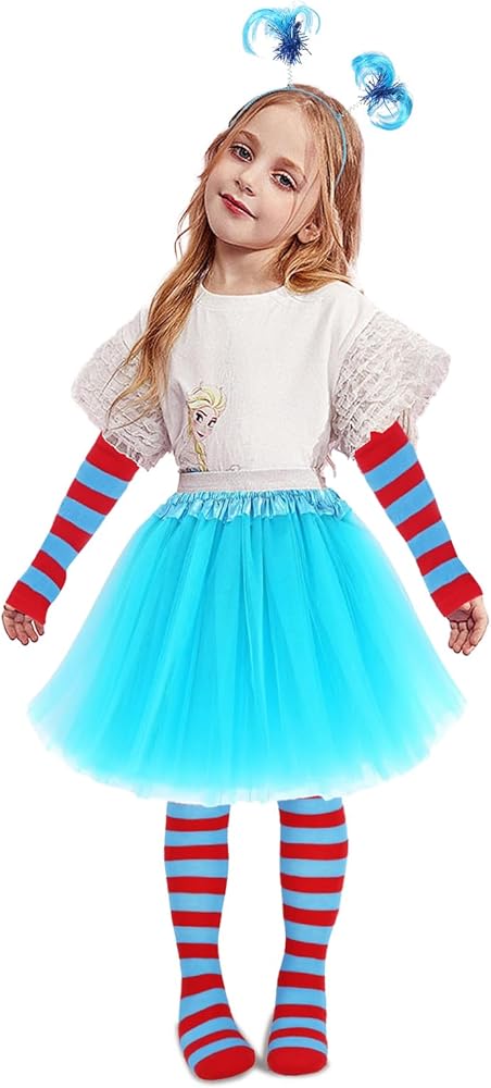• Dr Suess Accessories Set: each package includes 1 x layered tulle tutu skirt, 1 pair striped over knee stockings, 1 x blue feather and ponytail headband, 1 pair of long arm warmer thumb hole stretchy gloves, suitable for Halloween costume party or role-playing, and can add to your playing fun