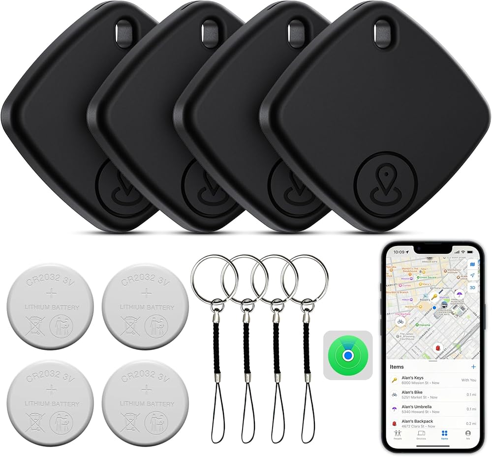 علامات التتبع - 4 حزم، جهاز تعقب بلوتوث يعمل مع Find My (iOS فقط)، جهاز البحث عن المفاتيح لعلامة Trakcer الذكية ومحدد موقع العناصر مع حبل قصير، وعلامة تعقب للمفاتيح، وبطارية قابلة للاستبدال للأمتعة
