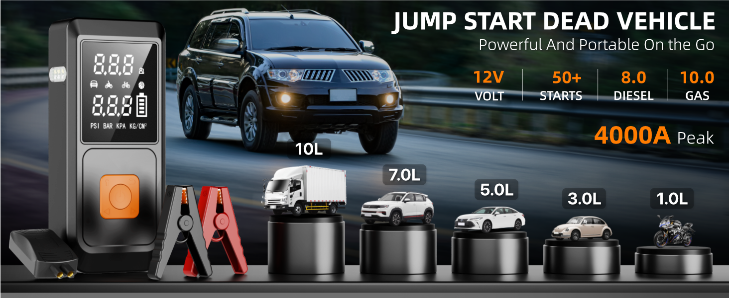 GOLDFOREST 4000A Jump Starter مع ضاغط هواء، بطارية السيارة المحمولة (10 لتر غاز/8 لتر ديزل)، صندوق القفز 150 رطل لكل بوصة مربعة مع منفاخ إطارات للإغلاق التلقائي، ضوء LED، بنك الطاقة - مجموعة طوارئ السيارة