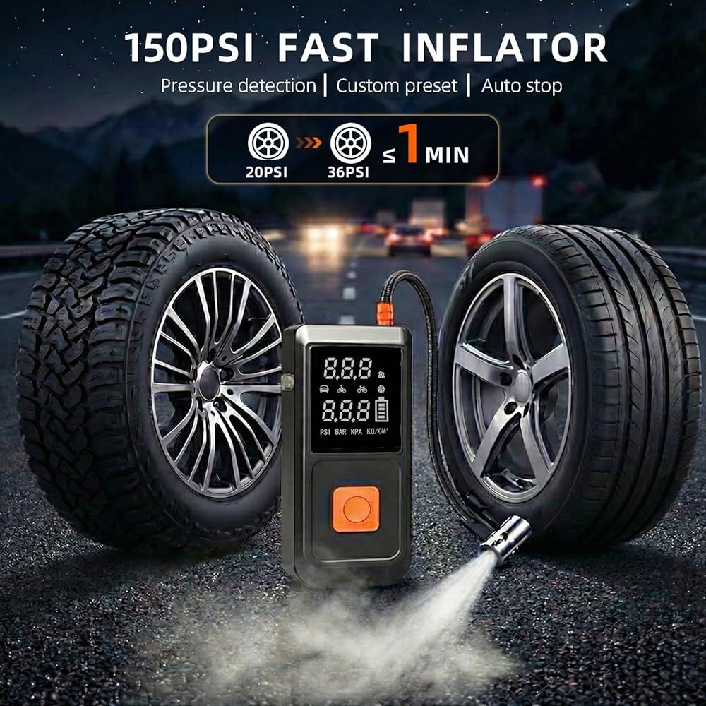 • [ضاغط هواء توربو ذكي 150 رطل لكل بوصة مربعة] محرك توربيني 30 لتر/الدقيقة ينفخ إطارات السيارة المسطحة (0-36 رطل لكل بوصة مربعة) في أقل من 5 دقائق. تقنية الضبط والنسيان: الإغلاق التلقائي عند الضغط المحدد مسبقًا يمنع التضخم الزائد. 5 أوضاع محددة مسبقًا، 4 وحدات ضغط (PSI/BAR/KPA/kg/cm2)، تتضمن 4 فوهات
