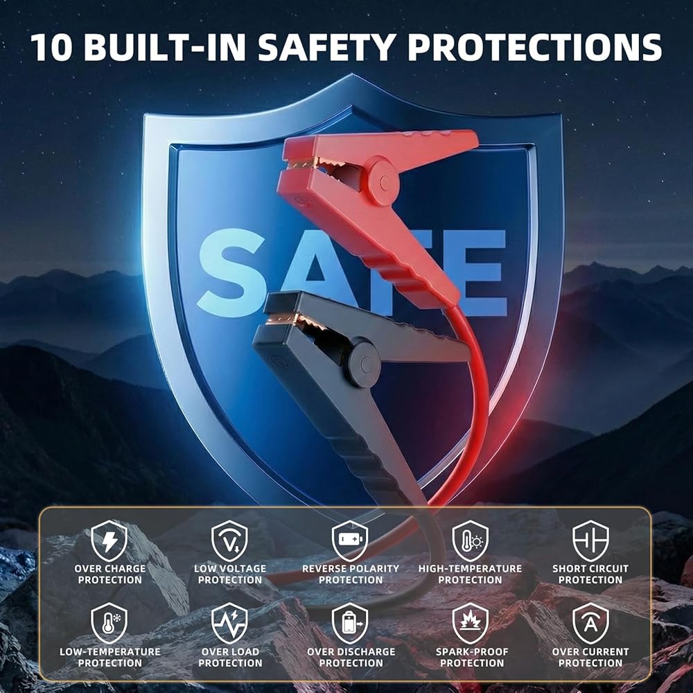 • [أمان 10 طبقات مع بطارية V0 مقاومة للحريق] تتميز مشابك القفز الذكية بتقنية مقاومة الشرر، ومنبه قطبي عكسي مع صوت تنبيه عالٍ وتحذير من الضوء الأحمر، والتيار الزائد، والدائرة القصيرة، وحماية درجة الحرارة. تتوافق خلايا الليثيوم الممتازة مع تصنيف مقاومة الحريق V0 لتحقيق أقصى قدر من الأمان