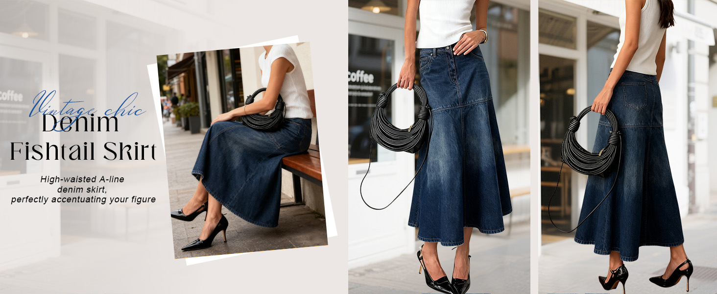 تنورة جينز طويلة متوسطة الطول للنساء، تتميز بطيات ذيل السمكة، طول تحت الركبة؛ تنورة من الدنيم على شكل حرف A بارتفاع عالٍ، تنحني جسمك بشكل مثالي، وتحتضن الصورة الظلية بشكل مثالي