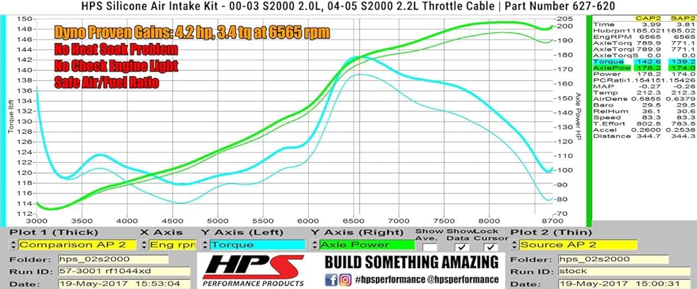 HPS 4-Ply Reinforced High Temp Black Silicone Short ram Air Intake Kit with HPS Performance air filter replaces the stock OEM restrictive rubber intake hose with high temp reinforced silicon material and replace the OEM cone filter with the bigger HPS performance air filter. HPS performance silicone short ram air intake kit improves air flow and throttle response, minimize the amount of heat soak by retaining the stock fresh air scoop and sealed air box design. The included air velocity stack also smooth out the air flow and reduce the amount of turbulence. Without any re-tuning, the HPS silicone post MAF air intake tube with HPS performance air filter delivers dyno-proven performance gains - increase horsepower +4. 2 Whip , torque +3. 4 Ft/lbs. The intake kit also makes the S2K sound louder and more aggressive compare to the stock intake setup. This silicone intake kit does NOT trigger check engine light. Installation time is approx. 1. 5 to 2 hours. Modification is required in order to fit the large HPS filter into the stock air box, which requires trimming the lid in the lower air intake box and removal of the internal snorkel in the upper air intake box. The All-New HPS Performance Air Filter is designed with performance in mind, delivering excellent filtration without sacrificing air flow. Washable and reusable. All HPS Performance Air Filters are made in the United States and backed by HPS limited lifetime . CARB Exempt: No. This HPS intake is designed for 2000-2003 Honda S2000 AP1 2. 0L / 2004-2005 Honda S2000 AP2 2. 2L Throttle Cable.
