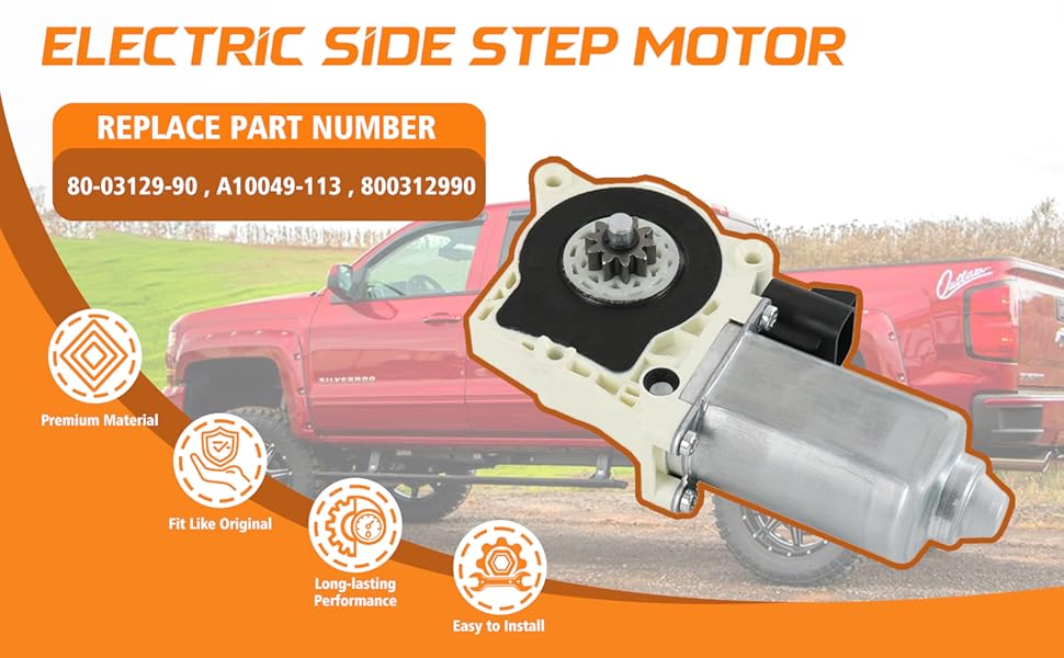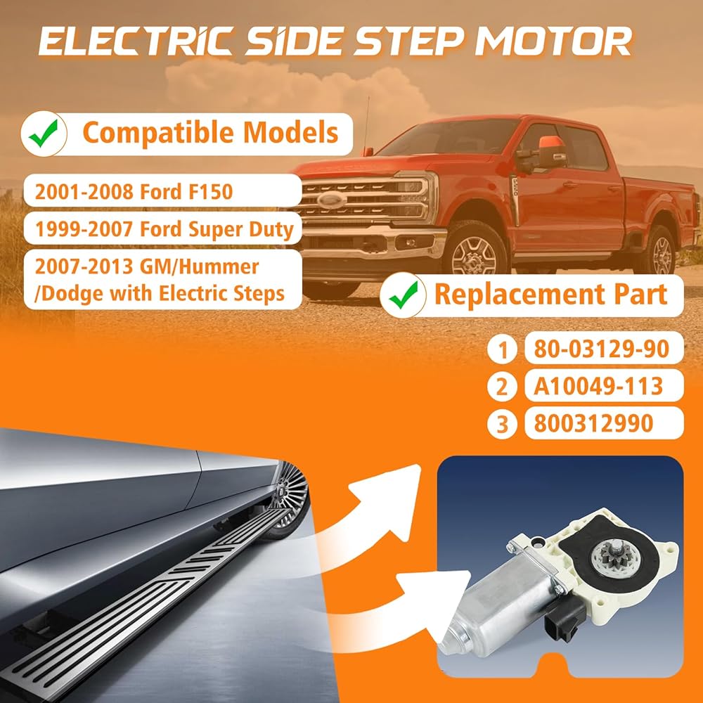 استبدل OE: محرك كهربائي جانبي 80-03129-90، A10049-113، 800312990. تتوافق مجموعة أدوات البحث البديلة هذه مع AMP Research، مما يضمن ملاءمة مثالية لمجموعتك.