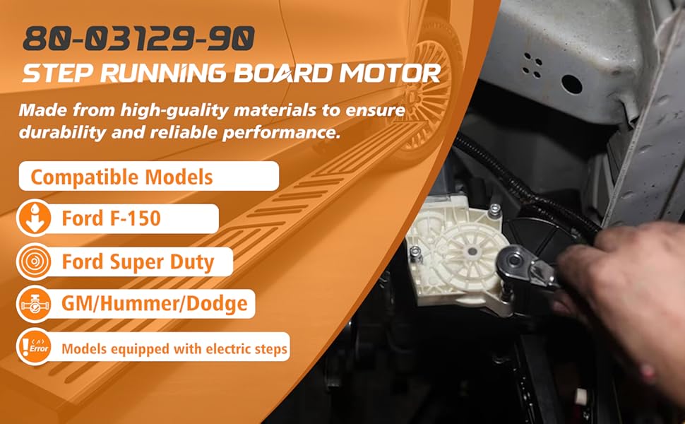 تطبيق واسع: يتوافق محرك الخطوات الجانبية الكهربائي الخاص بنا مع موديلات Ford F-150 وSuper Duty وGM وHummer وDodge المجهزة بخطوات كهربائية، مما يضمن تعدد الاستخدامات والتطبيق الواسع.
