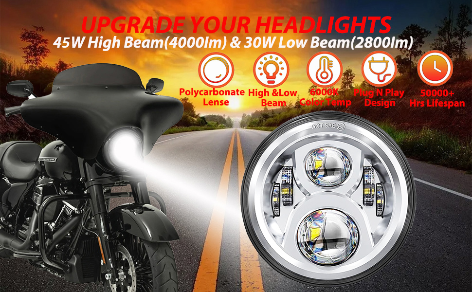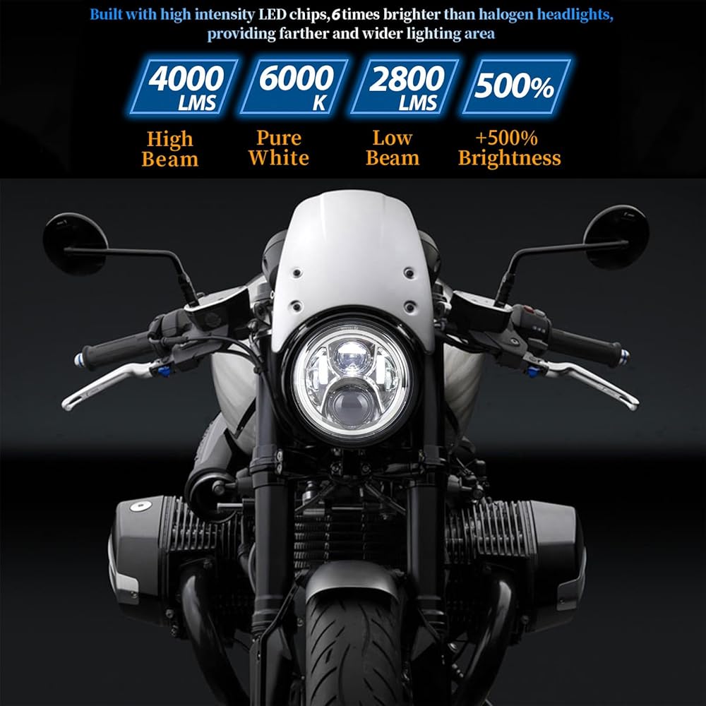 للمصابيح الأمامية مقاس 7 بوصة لهوندا وكاواساكي وسوزوكي إنديان تريومف فيكتوري بي إم دبليو بويل رويال إنفيلد ونماذج أخرى، ولكن يلزم إجراء تعديلات طفيفة على مجموعة الأسلاك أو حلقة التثبيت أثناء التثبيت. مصابيح أمامية Yamaha مقاس 7 بوصات V Star Road Star Classic Silveradois التوصيل والتشغيل (باستثناء 5.75 بوصة لـ V Star Custom)
