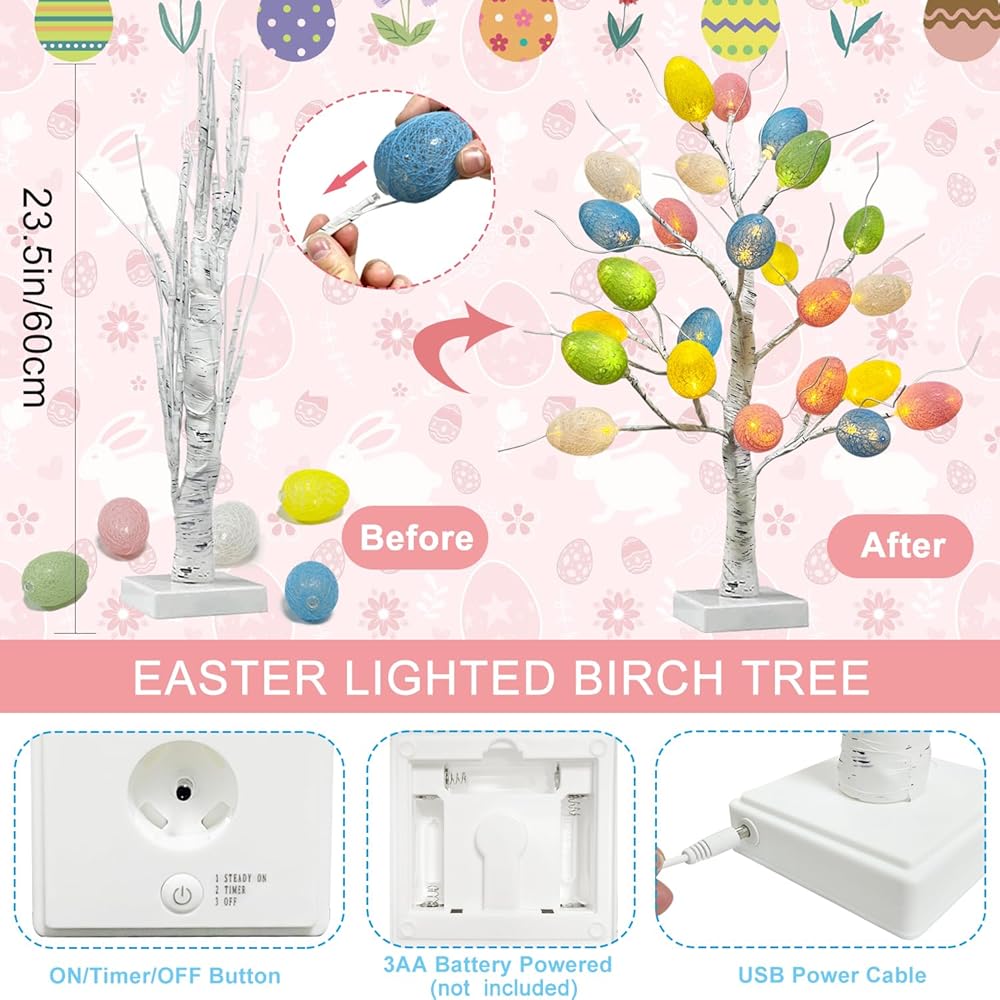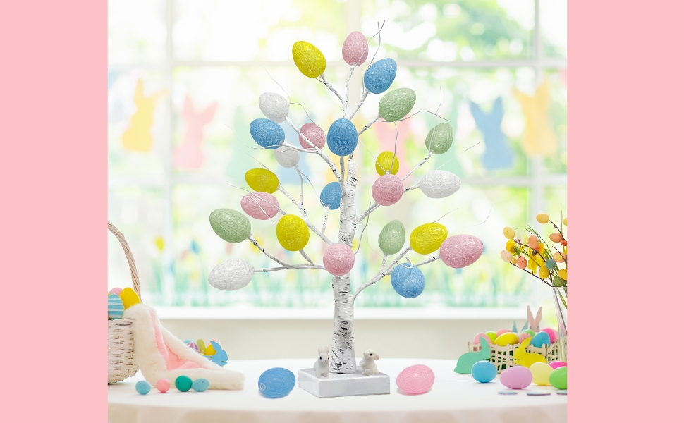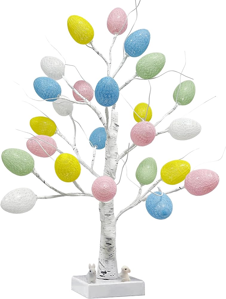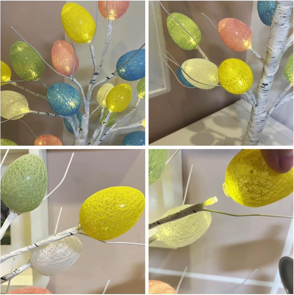 زينة شجرة عيد الفصح: مجموعة زينة عيد الفصح الجميلة تأتي مع مجموعة واحدة من شجرة البتولا المضيئة مع 24 مصباح LED أبيض دافئ، 24 قطعة من زخارف البيض البلاستيكية المصنوعة من خيوط القطن بتصميم 5 ألوان (أبيض/وردي/أصفر/رمادي/أزرق)، و2 بيني صغير من الراتنج. زينة مركزية لعيد الفصح لحفلة عيد الفصح الربيعية