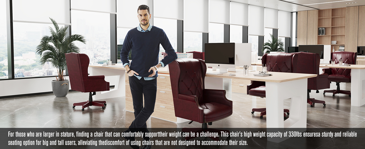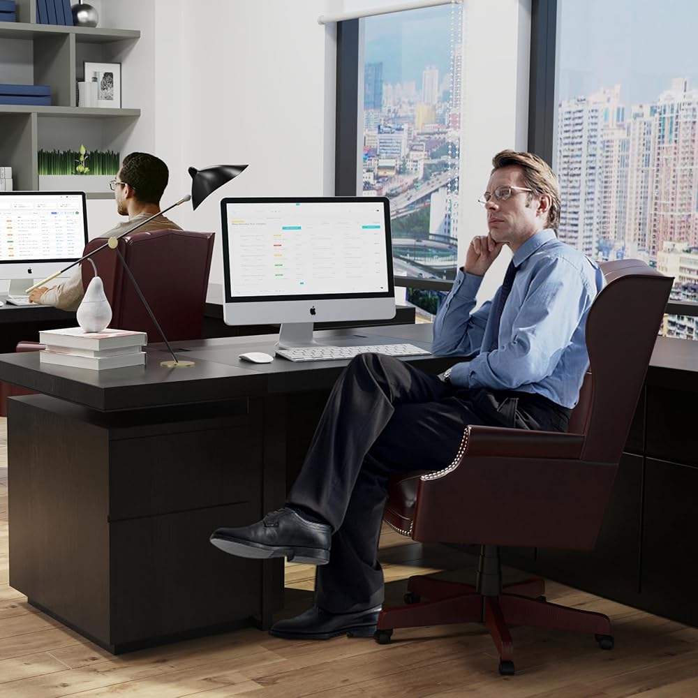 راحة ودعم لا مثيل لهما: استمتع براحة لا مثيل لها خلال أيام العمل الطويلة مع مقعدنا الإسفنجي عالي الكثافة والكرسي المصمم هندسيًا. لا يوفر التنجيد الجلدي الفاخر باللون العنابي شعورًا فاخرًا فحسب، بل يوفر أيضًا الدعم الأمثل لظهرك وأكتافك، مما يعزز وضعية أفضل وإنتاجية أفضل.