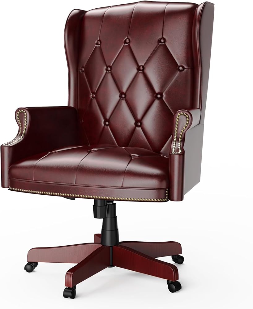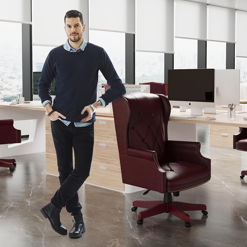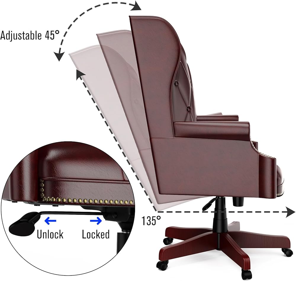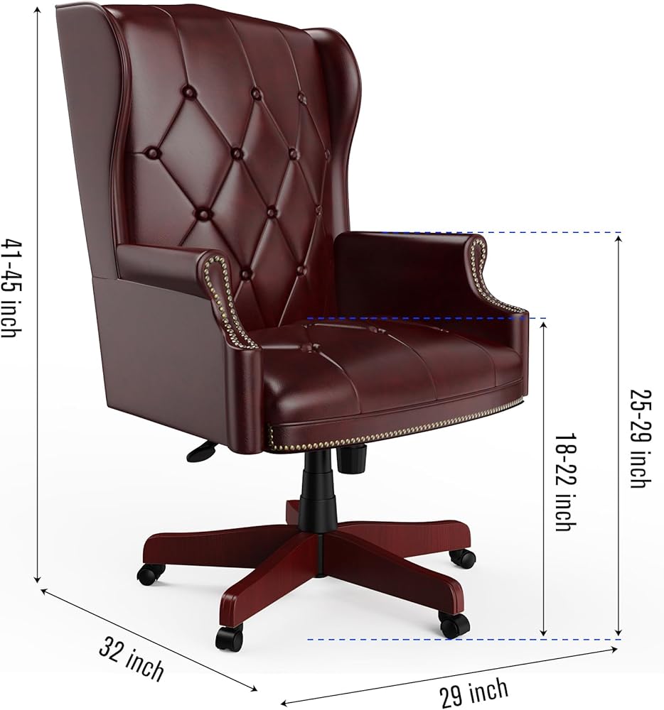 كرسي مكتب تنفيذي من الجلد عالي الظهر باللون العنابي، تصميم مريح شديد التحمل بوزن 330 رطل، مقعد مبطن سميك ومسند للظهر، كرسي مكتب مريح مع قاعدة خشبية و5 عجلات انزلاقية ناعمة