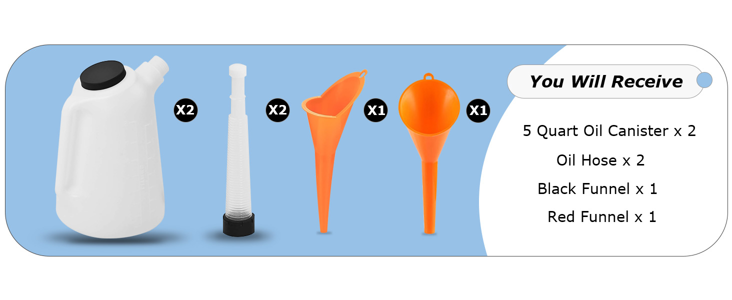 المجموعة الكاملة: تشتمل مجموعة حاويات الزيت الخاصة بنا على حاويتين لقياس الزيت، واحدة كبيرة وقمع زيت صغير لتغيير الزيت، لتلبية احتياجاتك في التخزين وإعادة التزود بالوقود. سواء كنت خزان وقود سيارة أو خزان جالون، يمكن لمجموعتنا أن توفر عملية توصيل وقود فعالة.
