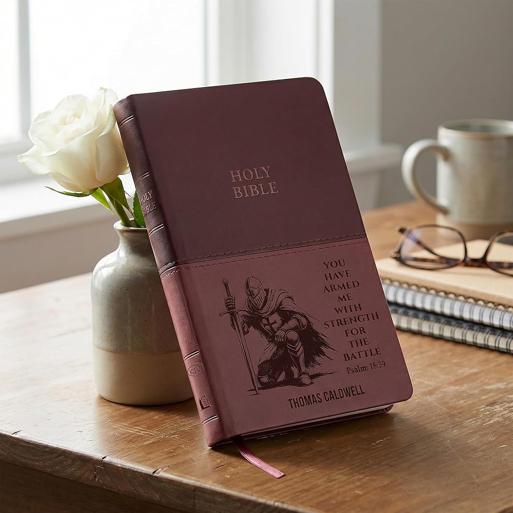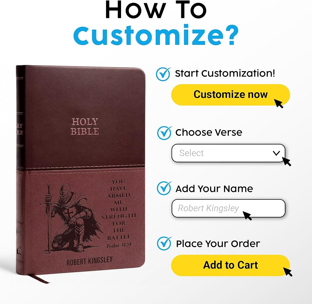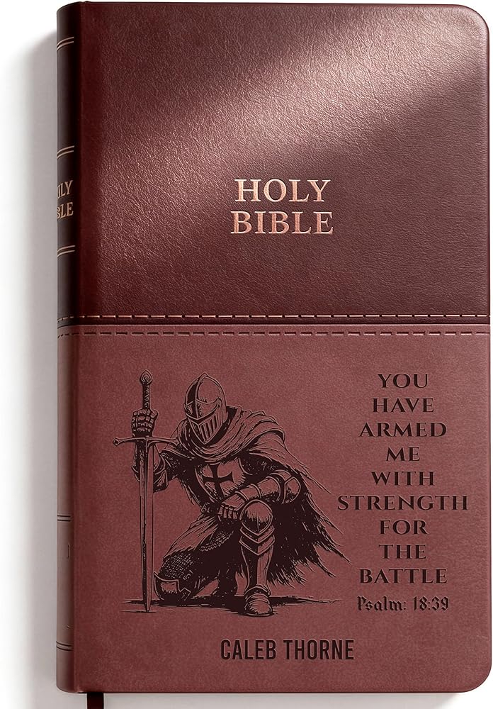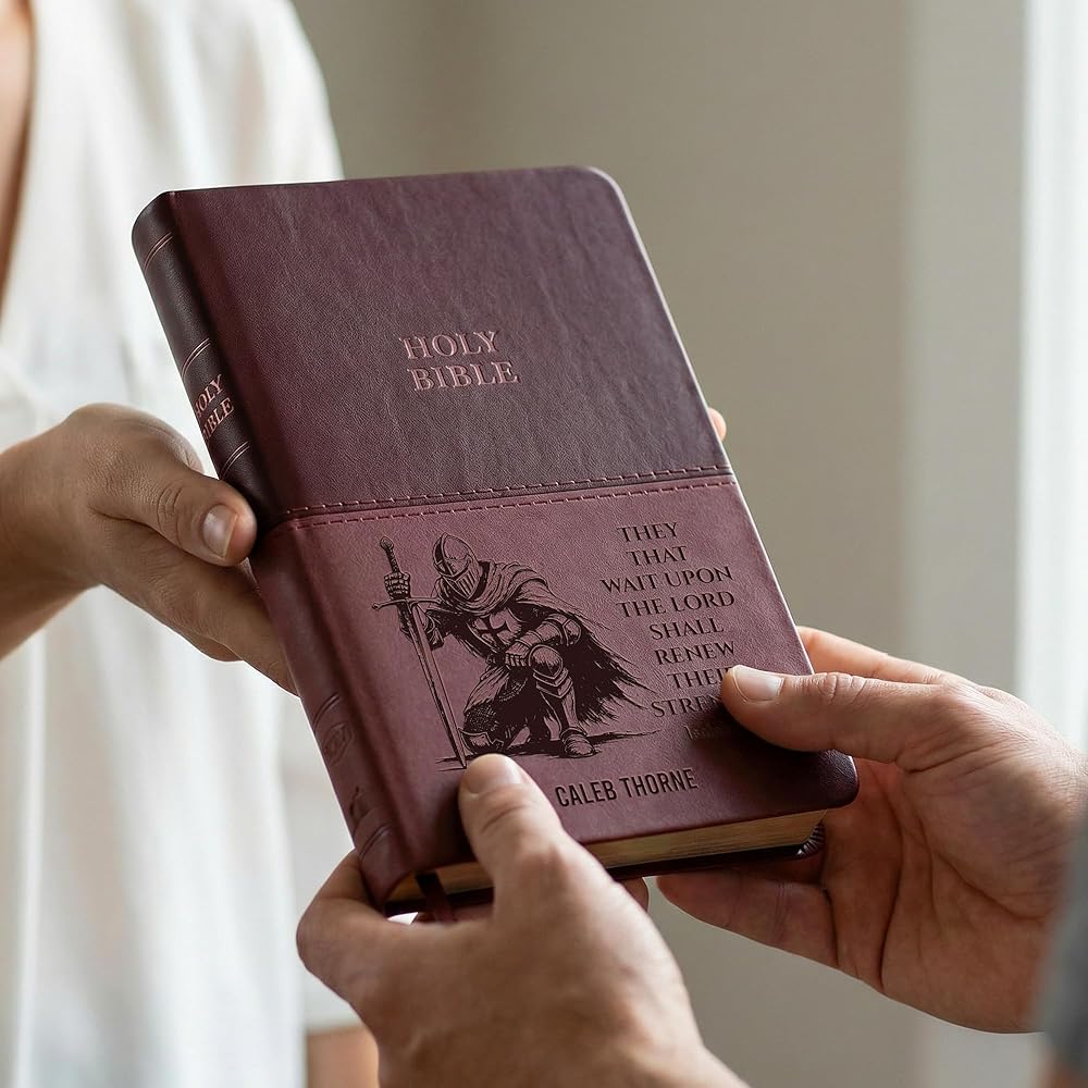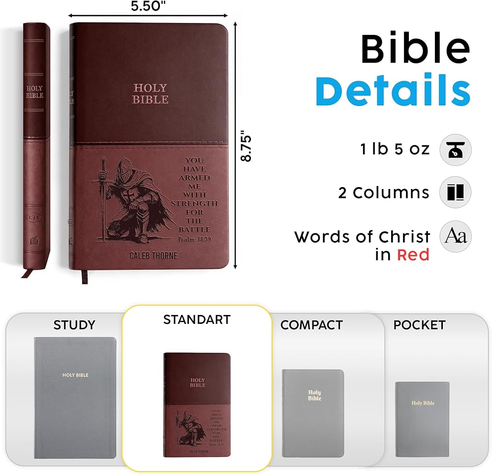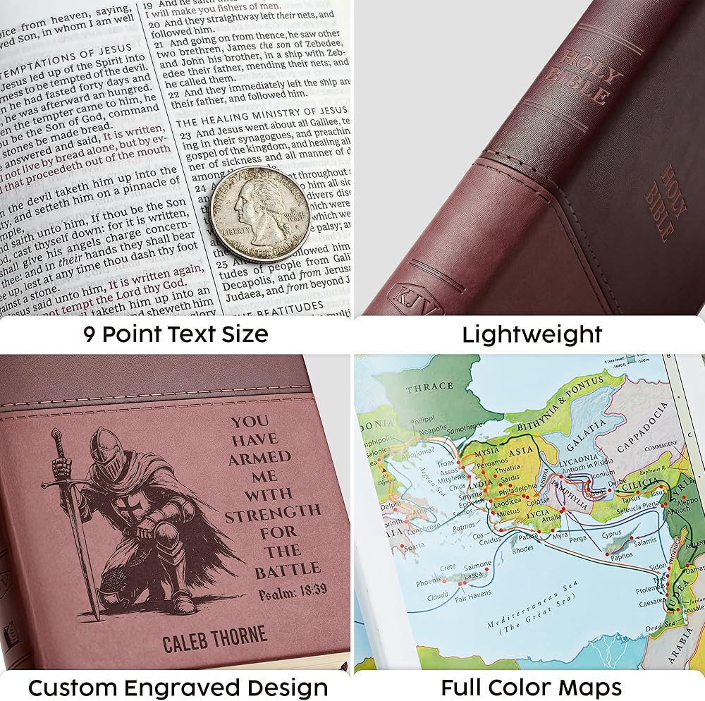 شخصية KJV الكتاب المقدس للرجال تصميم فارس منقوش، نسخة الملك جيمس رسالة حمراء، طباعة قياسية، اسم مخصص الآية الكتابية، هدية تأكيد المعمودية التخرج المسيحي، خط رفيع ذو قيمة بنية