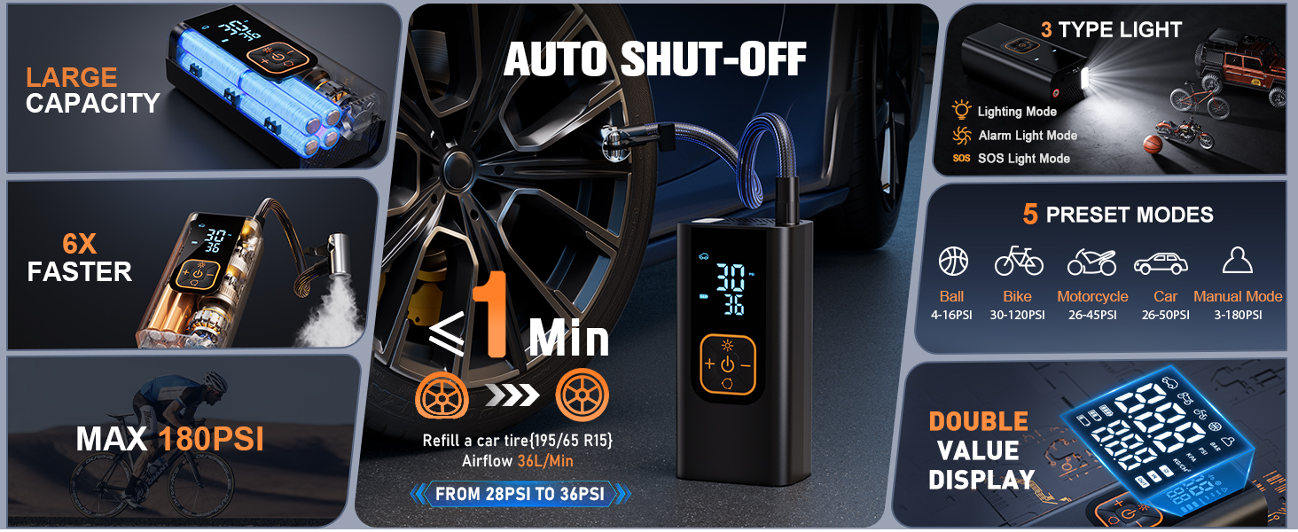 • [نفخ إطارات أسرع 6 مرات] - مدعومة بمحرك عالي الأداء 25,000 دورة في الدقيقة ونواة مضخة متقدمة، توفر مضخة هواء إطارات السيارة اللاسلكية هذه تدفق هواء 36 لتر/الدقيقة - أسرع 6 مرات من مضخة الهواء الكهربائية التقليدية للسيارة. يمكنها إعادة ملء إطار السيارة (225/75 R17) بسرعة من 28PSI إلى 36PSI في أقل من دقيقة واحدة. تعتبر مضخة الهواء المحمولة هذه ضرورية للاستعداد لحالات الطوارئ وإعادة التعبئة الفعالة