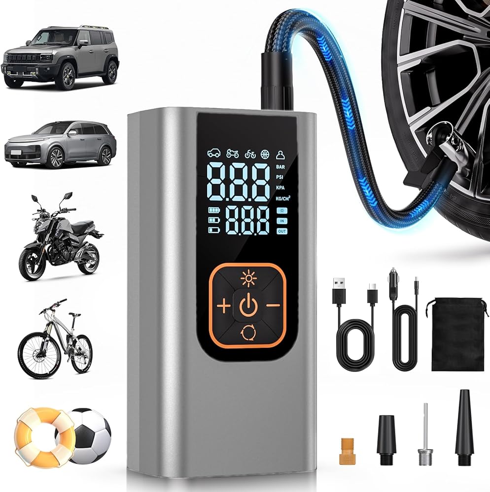 • [ما تحصل عليه] - منفاخ إطارات محمول ×1، خرطوم هواء ×1، محول سيارة 12 فولت تيار مستمر ×1، فوهة الإطارات ×1، محول صمام بريستا ×1، محول صمام شريدر ×1، إبرة كروية ×1، كابل USB-C ×1، حقيبة تخزين ×1، دليل المستخدم ×1. نحن نقدم ضمان المنتج لمدة عامين والدعم الفني مدى الحياة لمزيد من راحة البال