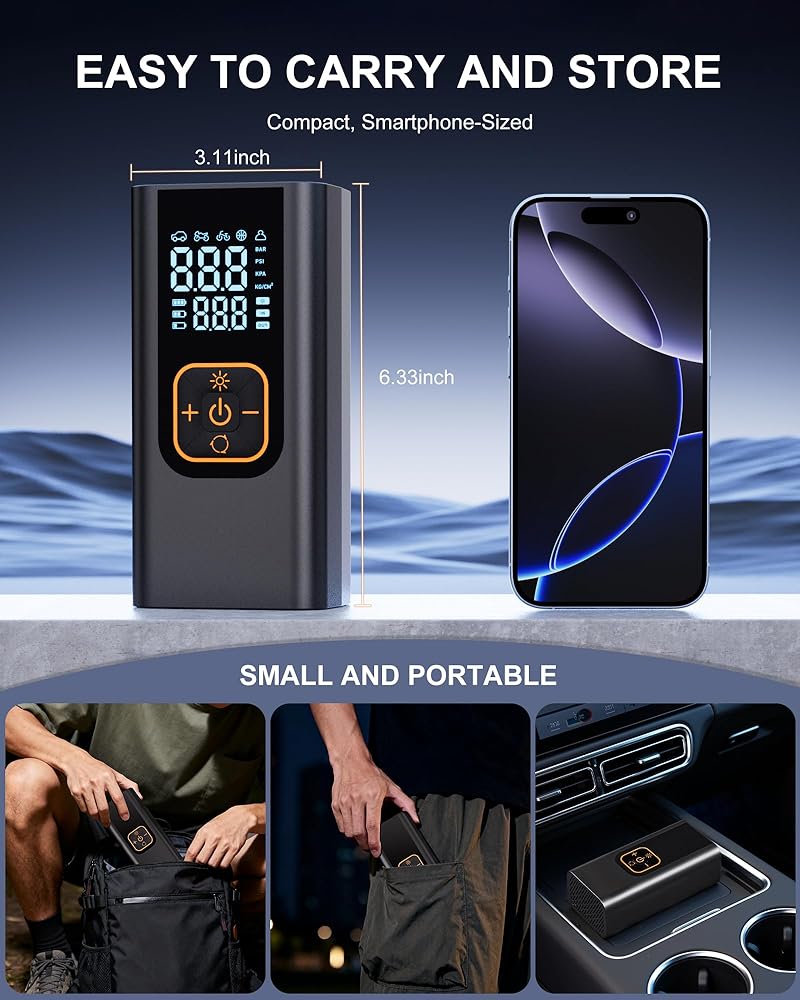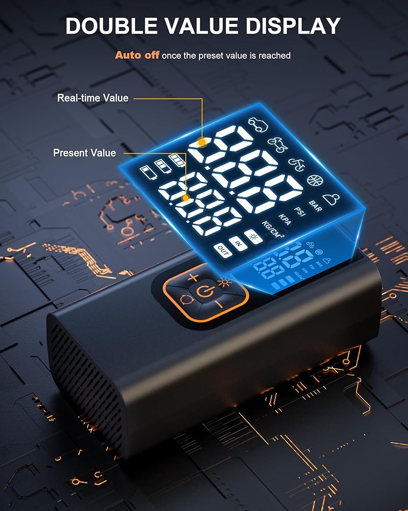• [شاشة عرض مزدوجة للدقة والوضوح] - يحتوي ضاغط الهواء للسيارة 12 فولت على شاشة LCD رقمية مزدوجة تعرض الضغط في الوقت الحقيقي والقيم المحددة مسبقًا في نفس الوقت، مما يجعل من السهل قراءة ومراقبة مقياس ضغط الإطارات الرقمي. كما أنها تحتوي على قلب مضخة ذكية عالية الأداء (بدقة ±1 رطل لكل بوصة مربعة). وتضمن شاشة LCD الكبيرة رؤية سهلة لقيم ضغط الإطارات حتى في ضوء الشمس الساطع.
